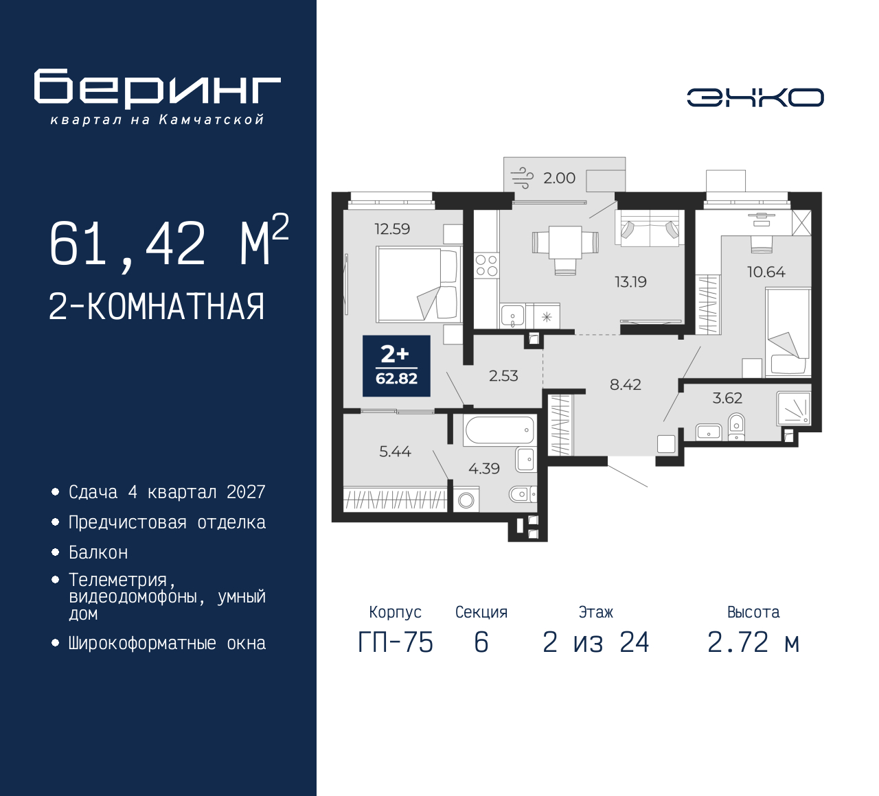 2-комн. квартира от застройщика с предчистовой отделкой в ЖК "Беринг" на 2 этаже. Общая площадь: 61.42 кв.м., жилая: 23.23 кв.м., площадь просторной кухни-столовой: 13.19 кв.м. Комнаты изолированные, все окна выходят на одну сторону. В квартире один балкон, два совмещенных санузла. Высота потолков 2.72 м. Дом монолитный, многоподъездный, переменной этажности, от 17 до 24 этажей. Квартира находится в 6-й секции высотой 24 этажа в корпусе ГП-75. На этаже 6 квартир. В подъезде 2 пассажирских и 1 грузовой лифт. Окончание строительства - 4 квартал 2027 года. Оформление сделки по договору долевого участия. Подобно знаменитому исследователю, мы чувствуем себя первооткрывателями этой локации. Хотим показать новую суть места, сформировать для вас жизненный опыт, которого ещё не было. Беринг — район зелёного цвета. Беринг — район, который откроется вам с другой стороны. Впечатлит новым уровнем комфорта и качеством жизни. Беринг — открытие на карте города. Первый квартал расположен в районе Тура, в границах улиц: Камчатская – Западносибирская – Энтузиастов. Вокруг уже есть всё для того, чтобы ежедневная рутина была лишь частью жизни и не доставляла дискомфорта. Школы и детские сады, магазины и аптеки, поликлиника, места для семейного отдыха, пеших и велопрогулок, и даже рыбалки. Масштабное озеленение дворов — визитная карточка ЭНКО и ваш оазис спокойствия, чтобы отвлечься от повседневности. Раскидистые деревья, кустарники, травы и цветы — осталось остановиться, вдохнуть и расслабиться, глядя на эту природную красоту. Стилистика подъездов продолжает концепцию Беринга, вдохновлённого Камчаткой: сдержанный, но при этом впечатляющий дизайн соседствует с удобством и функциональностью. (AQID02529722)