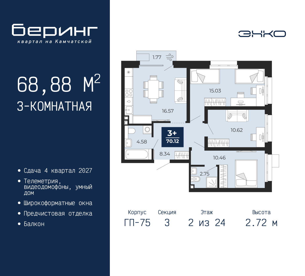 3-комн. квартира с предчистовой отделкой в ЖК "Беринг" на 2 этаже. Общая площадь: 68.88 кв.м., жилая: 36.11 кв.м., площадь просторной кухни-столовой: 16.57 кв.м. Угловая квартира, окна oбecпeчивaют paвнoмepнoe ocвeщeниe в тeчeниe дня. В квартире один балкон, два совмещенных санузла. Высота потолков 2.72 м. Дом монолитный, многоподъездный, переменной этажности, от 17 до 24 этажей. Квартира находится в 3-й секции высотой 24 этажа в корпусе ГП-75. На этаже 6 квартир. В подъезде 2 пассажирских и 1 грузовой лифт. Окончание строительства - 4 квартал 2027 года. Оформление сделки по договору долевого участия. Подобно знаменитому исследователю, мы чувствуем себя первооткрывателями этой локации. Хотим показать новую суть места, сформировать для вас жизненный опыт, которого ещё не было. Беринг — район зелёного цвета. Беринг — район, который откроется вам с другой стороны. Впечатлит новым уровнем комфорта и качеством жизни. Беринг — открытие на карте города. Первый квартал расположен в районе Тура, в границах улиц: Камчатская – Западносибирская – Энтузиастов. Вокруг уже есть всё для того, чтобы ежедневная рутина была лишь частью жизни и не доставляла дискомфорта. Школы и детские сады, магазины и аптеки, поликлиника, места для семейного отдыха, пеших и велопрогулок, и даже рыбалки. Масштабное озеленение дворов — визитная карточка ЭНКО и ваш оазис спокойствия, чтобы отвлечься от повседневности. Раскидистые деревья, кустарники, травы и цветы — осталось остановиться, вдохнуть и расслабиться, глядя на эту природную красоту. Стилистика подъездов продолжает концепцию Беринга, вдохновлённого Камчаткой: сдержанный, но при этом впечатляющий дизайн соседствует с удобством и функциональностью. (AQID02529750)