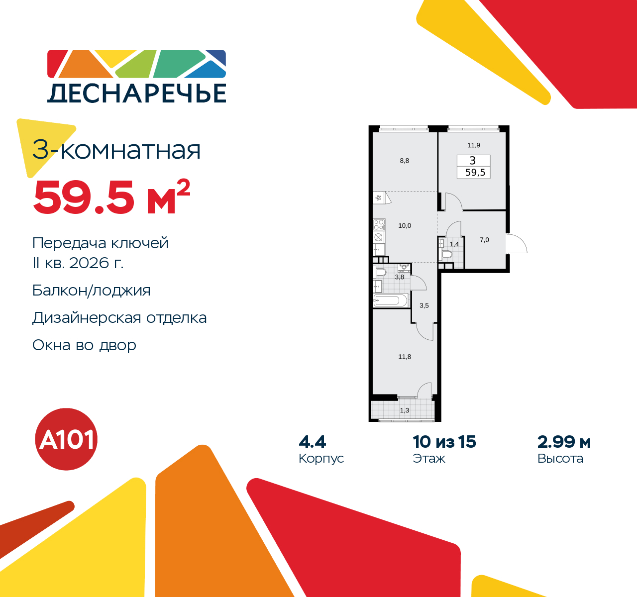 Продается трехкомнатная квартира с европланировкой и предчистовой отделкой в ЖК "Деснаречье" на 10 этаже. Общая площадь: 59.5 кв.м., жилая: 32.5 кв.м., общая площадь гостиной-столовой с кухонной зоной: 18.8 кв.м. Европейская планировка, кухня-гостиная - идеальный вариант для тех, кто любит часто принимать гостей. Квартира - распашонка, без проходных комнат, окна выходят на paзные стороны дома. В квартире один балкон, один совмещенный и один раздельный санузел. Высота потолков 2.99 м. Эта квартира будет сдана с предчистовой отделкой white box – это квартира с ровными белыми стенами. Такая отделка позволяет сразу приступить к чистовой отделке: выбрать цвета и материалы для стен и полов, купить и расставить мебель и оборудование, развесить светильники и подобрать декор. При желании вы можете дозаказать дизайнерскую отделку от застройщика, на ваш выбор представлено несколько вариантов стилистических решений. Дом монолитный, черырехподъездный, высотой 15 этажей. Квартира находится в 3-й секции в корпусе 4.4. На этаже 5 квартир. В подъезде 1 пассажирский и 1 грузовой лифт. Начало строительства - 3 квартал 2023 года. Окончание строительства - 2 квартал 2026 года. Оформление сделки по договору долевого участия. Артикул квартиры по базе застройщика 88К-4.4-935. ПРЕДЛОЖЕНИЯ ОТ ЗАСТРОЙЩИКА В ОКТЯБРЕ 2025: Ипотека от 13,9 % для всех! На весь срок. "Семейная ипотека" вернулась. Ставка от 3,5 % на весь срок! Без удорожания! Выгодное ипотечное комбо: Ипотека от 2200 р./мес. и от 6 % после рождения ребёнка! Ипотека для всех "Держи пять!" - ставка 5 % на 2 года! *более подробную информацию по скидкам и акциям уточняйте в отделе продаж Масштабный проект "Деснаречье" на юго-западе Москвы, который включает три новых района («квартала»), объединённые общей идеей – воплотить в реальность мечты современных жителей столицы об интересном, комфортном и разноплановом городском пространстве в окружении рек и лесов, словно сошедших с полотен русских живописцев: - «Берег» оценят все, кому близка водная стихия: плеск волн, солнечные блики и прогулки вдоль тихого течения речи. - «Лес» утопает в зелени парков и лесов. Здесь соблюдён идеальный баланс загородного спокойствия и столичного комфорта. - «Парк», самый энергичный и яркий, отличается высокой концентрацией пространств для спорта и творчества. Жилой комплекс "Деснаречье" расположится в 12 км от МКАД по современному Калужскому шоссе. Внешний облик зданий соответствует современному стилю и стандартам, характерным и для других популярных проектов ГК «А101»: сочетание контрастных тонов, большое количество остекления, в котором отражается небо, гармония с природным окружением. Весь город - в вашем районе. Находиться на территории «15-минутного города» значит иметь всё необходимое для полноценной жизни в шаговой доступности. Маршруты в районе «Деснаречье» выстроены так, чтобы добраться до магазинов, парков, школ, салонов услуг и других объектов можно было всего за несколько минут пешком или на велосипеде. Двор закрытый от машин – это тишина, комфорт и безопасность, поэтому все машино-места (включая «семейные» и увеличенные, с возможностью установки роллетных шкафов) находятся в подземном паркинге. В паркинги можно спуститься на лифте из любого подъезда или по лестнице. Рядом с «Деснаречьем» в 2027 году планируется открытие станции метро «Десна», до которой буде