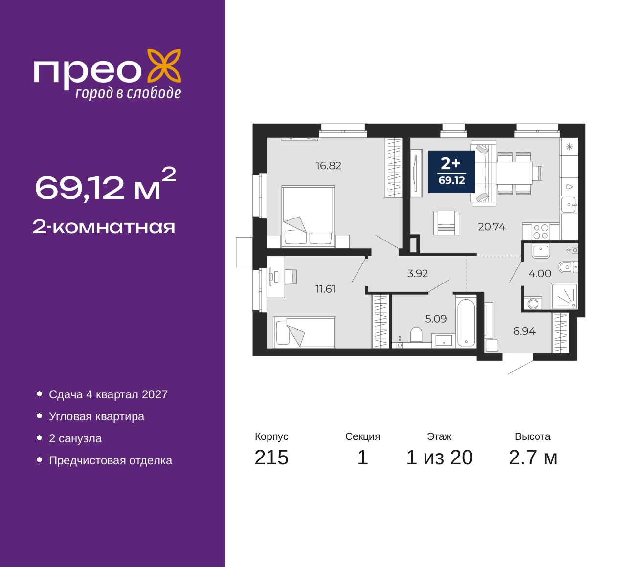 Продается двухкомнатная квартира от застройщика с предчистовой отделкой в ЖК "Прео" на 1 этаже. Общая площадь: 69.12 кв.м., жилая: 28.43 кв.м., площадь просторной кухни-столовой: 20.74 кв.м. Квартира угловая, идеально подойдет любителям тишины и панорамных видов. В квартире два совмещенных санузла. Высота потолков 2.7 м. Квартира находится в корпусе 215. Дом монолитный, одноподъездный, высотой 20 этажей. На этаже 8 квартир. В подъезде 1 пассажирский и 1 грузовой лифт. Окончание строительства - 4 квартал 2027 года. Оформление сделки по договору долевого участия. Преображенский — один из самых привлекательных районов для жизни! Это полностью самостоятельный жилой район с точки зрения инфраструктуры. Преображенский находится между Московским и Червишевским трактами в квартале улиц Закалужская — Вьюжная — Александра Протозанова. Не нужно ждать, когда появится инфраструктура — переезжайте на всё готовое. Вблизи расположены действующие школа и детский сад. В этом году откроется еще один сад, а в следующем году — школа. По соседству с Преображенским запланировано строительство городского парка «Комарово» площадью 38 гектар. За 10 минут можно доехать на автомобиле до крупных ТРЦ: «Лента», «Кристалл», «Леруа Мерлен», «Метро» и «Ашан». С 2018 года в районе открыт Соседский центр — пространство, созданное для формирования добрососедской среды, совместного досуга, общения и реализации соседских инициатив. Здесь проходят встречи соседей, а также сами жители района организовывают мероприятия. Организатором такого события может стать любой желающий. В квартирах выполнена качественная предчистовая отделка. Гладкие стены с финишным выравниванием по маякам. Ровный потолок для установки натяжного потолка. Установлены пятикамерные окна с двойным стеклопакетом (3 стекла). Дизайнерские холлы с видеонаблюдением, безбарьерным и прозрачным входом – всегда светло и спокойно. На первом этаже есть просторные колясочные, где все жители могут оставлять свои коляски и велосипеды. В Преображенском есть всё, что нужно для активного отдыха и занятий спортом. Мы сделали большое футбольное поле с безопасным покрытием. Также установили хоккейный корт, который оборудован по всем необходимым стандартам. Во дворах можно делать упражнения на специальных площадках с турниками. Весь район мы обустроили велодорожками, которые связаны в единый маршрут. У нас есть сухие фонтаны, бьющие из земли, деревья, веревки, сетки, скалодром, газон, песок и резинка — осталось просто дать своему ребенку право на свободную игру. По-настоящему хорошие дворы — это те, которые дети предпочитают соцсетям и телевизору. Аккредитация в банках: ПАО «Банк Уралсиб», ПАО «Газпромбанк», ОАО «Альфа-Банк», «Сбербанк России», ПАО Банк «ВТБ» и других. (AQID02525635)