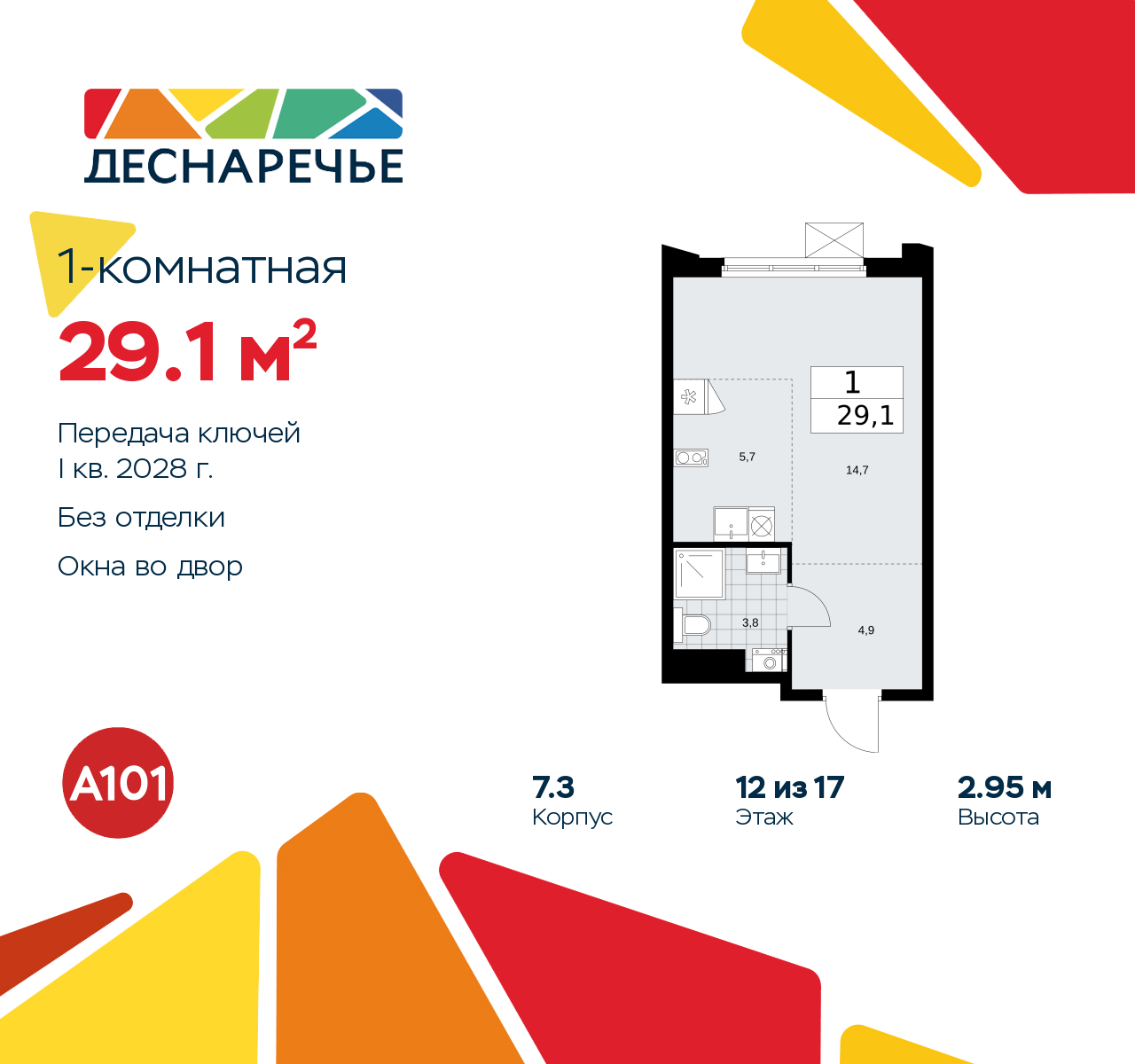 Продается однокомнатная квартира-студия в ЖК "Деснаречье" на 12 этаже. Квартира без отделки, полностью готова к чистовой отделке и дальнейшему ремонту. Общая площадь: 29.1 кв.м., площадь гостиной 20.4 кв.м., из которых 5.7 кв.м. выделено под кухонную зону. Все окна выходят на одну сторону. В квартире один совмещенный санузел. Высота потолков 2.95 м. Эта квартира предлагается без отделки. Будут установлены стеклопакеты с повышенной тепло- и шумоизоляцией, в квартиру заведены все коммуникации. Вы сможете в полном объеме реализовать ваши идеи обустройства вашего комфортного дома. Для тех, кто ценит время и не хочет дополнительных трат на ремонт мы предлагаем квартиры с предчистовой и дизайнерской отделкой. Дом монолитный, черырехподъездный, переменной этажности, от 9 до 17 этажей. Квартира находится в 4-й секции высотой 16 этажей в корпусе 7.3. На этаже 5 квартир. В подъезде 1 пассажирский и 1 грузовой лифт. Начало строительства - 2 квартал 2025 года. Окончание строительства - 1 квартал 2028 года. Оформление сделки по договору долевого участия. Артикул квартиры по базе застройщика 88К-7.3-847. ПРЕДЛОЖЕНИЯ ОТ ЗАСТРОЙЩИКА В ОКТЯБРЕ 2025: Ипотека от 13,9 % для всех! На весь срок. "Семейная ипотека" вернулась. Ставка от 3,5 % на весь срок! Без удорожания! Выгодное ипотечное комбо: Ипотека от 2200 р./мес. и от 6 % после рождения ребёнка! Ипотека для всех "Держи пять!" - ставка 5 % на 2 года! *более подробную информацию по скидкам и акциям уточняйте в отделе продаж Масштабный проект "Деснаречье" на юго-западе Москвы, который включает три новых района («квартала»), объединённые общей идеей – воплотить в реальность мечты современных жителей столицы об интересном, комфортном и разноплановом городском пространстве в окружении рек и лесов, словно сошедших с полотен русских живописцев: - «Берег» оценят все, кому близка водная стихия: плеск волн, солнечные блики и прогулки вдоль тихого течения речи. - «Лес» утопает в зелени парков и лесов. Здесь соблюдён идеальный баланс загородного спокойствия и столичного комфорта. - «Парк», самый энергичный и яркий, отличается высокой концентрацией пространств для спорта и творчества. Жилой комплекс "Деснаречье" расположится в 12 км от МКАД по современному Калужскому шоссе. Внешний облик зданий соответствует современному стилю и стандартам, характерным и для других популярных проектов ГК «А101»: сочетание контрастных тонов, большое количество остекления, в котором отражается небо, гармония с природным окружением. Весь город - в вашем районе. Находиться на территории «15-минутного города» значит иметь всё необходимое для полноценной жизни в шаговой доступности. Маршруты в районе «Деснаречье» выстроены так, чтобы добраться до магазинов, парков, школ, салонов услуг и других объектов можно было всего за несколько минут пешком или на велосипеде. Двор закрытый от машин – это тишина, комфорт и безопасность, поэтому все машино-места (включая «семейные» и увеличенные, с возможностью установки роллетных шкафов) находятся в подземном паркинге. В паркинги можно спуститься на лифте из любого подъезда или по лестнице. Рядом с «Деснаречьем» в 2027 году планируется открытие станции метро «Десна», до которой будет удобно добраться пешком или на велосипеде. Дорога на автомобиле до перехватывающих парковок станций «Ольховая» и «Прокшино» займёт около 10 минут. В процессе р
