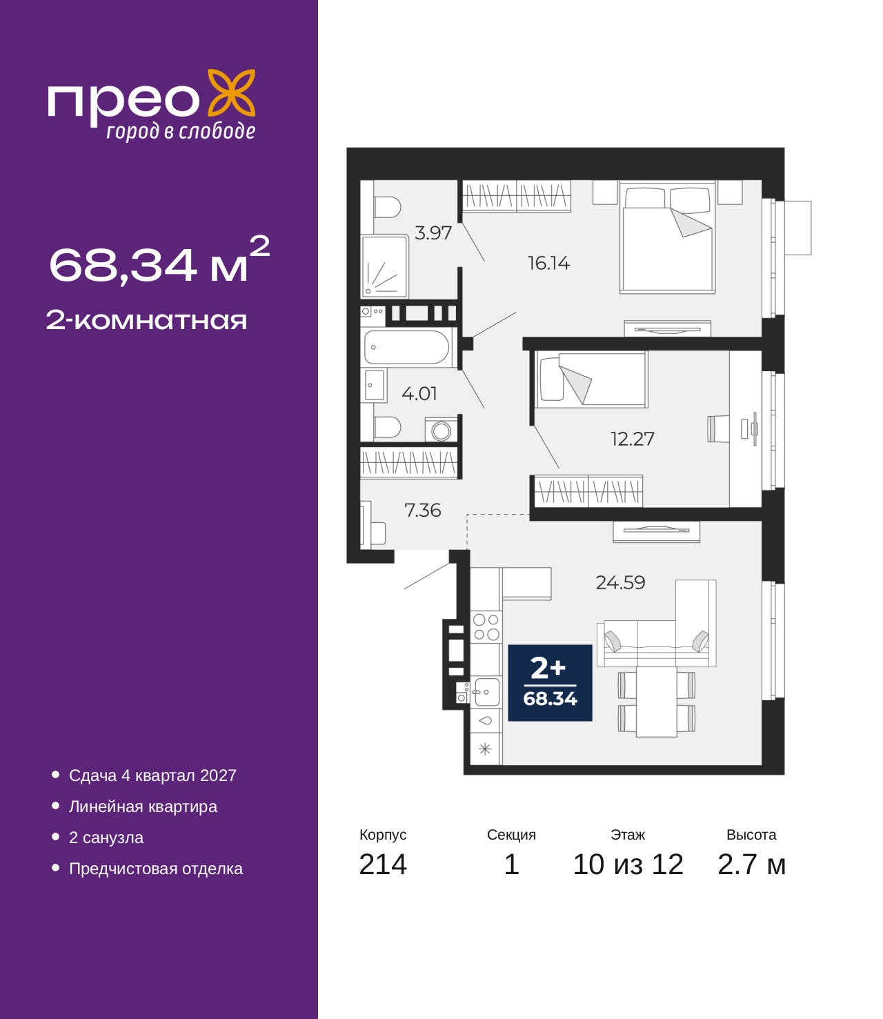 Продается 2-комн. квартира с предчистовой отделкой в ЖК "Прео" на 10 этаже. Общая площадь: 68.34 кв.м., жилая: 28.41 кв.м., площадь просторной кухни-столовой: 24.59 кв.м. Комнаты изолированные, все окна выходят на одну сторону. В квартире два совмещенных санузла. Высота потолков 2.7 м. Дом монолитный, двухподъездный, переменной этажности, от 12 до 20 этажей. Квартира находится в 1-й секции высотой 12 этажей в корпусе 214. На этаже 8 квартир. В подъезде 1 пассажирский и 1 грузовой лифт. Окончание строительства - 4 квартал 2027 года. Оформление сделки по договору долевого участия. Преображенский — один из самых привлекательных районов для жизни! Это полностью самостоятельный жилой район с точки зрения инфраструктуры. Преображенский находится между Московским и Червишевским трактами в квартале улиц Закалужская — Вьюжная — Александра Протозанова. Не нужно ждать, когда появится инфраструктура — переезжайте на всё готовое. Вблизи расположены действующие школа и детский сад. В этом году откроется еще один сад, а в следующем году — школа. По соседству с Преображенским запланировано строительство городского парка «Комарово» площадью 38 гектар. За 10 минут можно доехать на автомобиле до крупных ТРЦ: «Лента», «Кристалл», «Леруа Мерлен», «Метро» и «Ашан». С 2018 года в районе открыт Соседский центр — пространство, созданное для формирования добрососедской среды, совместного досуга, общения и реализации соседских инициатив. Здесь проходят встречи соседей, а также сами жители района организовывают мероприятия. Организатором такого события может стать любой желающий. В квартирах выполнена качественная предчистовая отделка. Гладкие стены с финишным выравниванием по маякам. Ровный потолок для установки натяжного потолка. Установлены пятикамерные окна с двойным стеклопакетом (3 стекла). Дизайнерские холлы с видеонаблюдением, безбарьерным и прозрачным входом – всегда светло и спокойно. На первом этаже есть просторные колясочные, где все жители могут оставлять свои коляски и велосипеды. В Преображенском есть всё, что нужно для активного отдыха и занятий спортом. Мы сделали большое футбольное поле с безопасным покрытием. Также установили хоккейный корт, который оборудован по всем необходимым стандартам. Во дворах можно делать упражнения на специальных площадках с турниками. Весь район мы обустроили велодорожками, которые связаны в единый маршрут. У нас есть сухие фонтаны, бьющие из земли, деревья, веревки, сетки, скалодром, газон, песок и резинка — осталось просто дать своему ребенку право на свободную игру. По-настоящему хорошие дворы — это те, которые дети предпочитают соцсетям и телевизору. Аккредитация в банках: ПАО «Банк Уралсиб», ПАО Банк «ВТБ», «Сбербанк России», ПАО «Газпромбанк», ОАО «Альфа-Банк» и других. (AQID02525634)