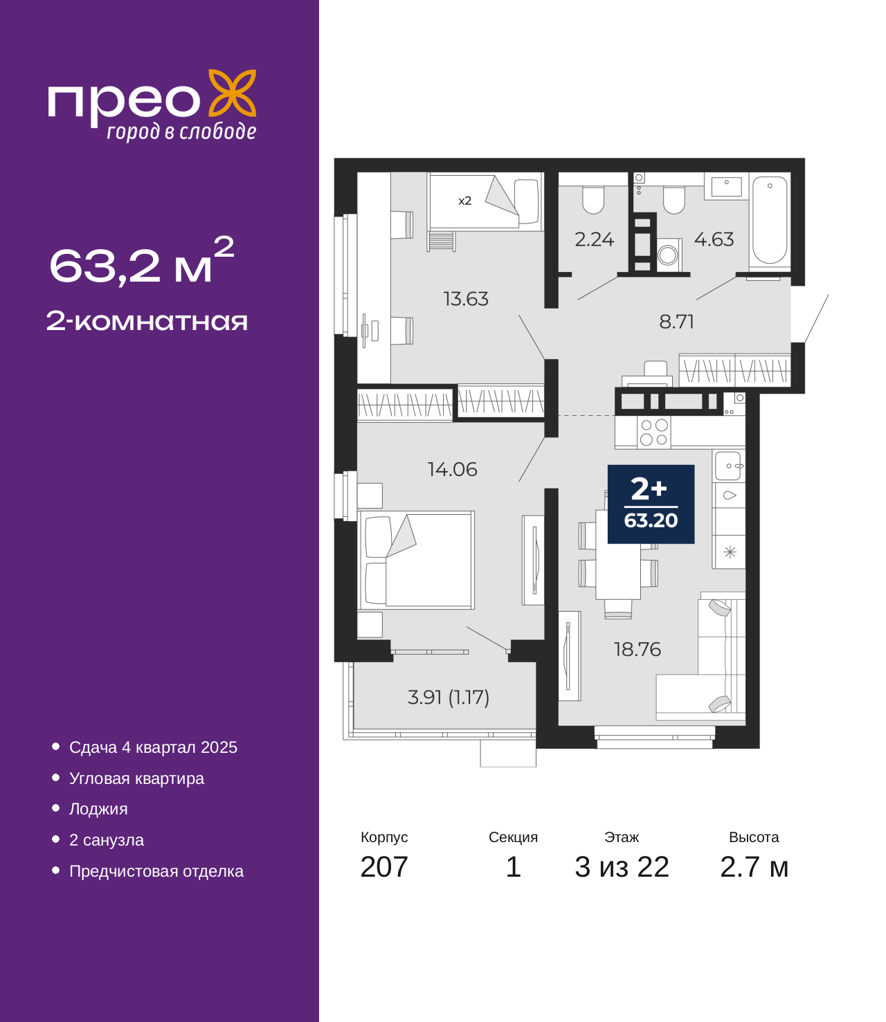 - Общая площадь 63.2 м²