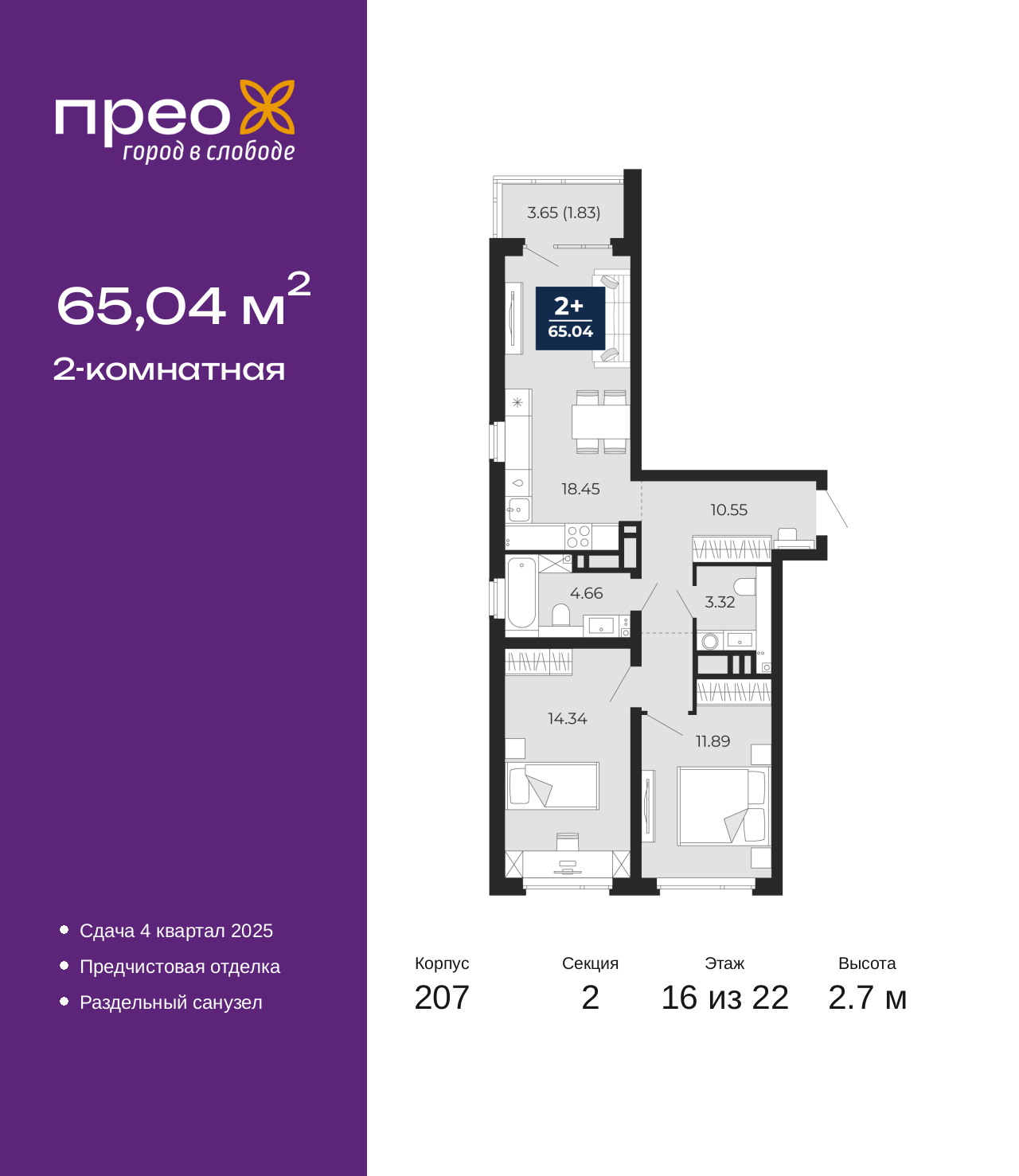 Двухкомнатная квартира с предчистовой отделкой в ЖК "Прео" на 16 этаже. Общая площадь: 65.04 кв.м. Высота потолков 2.7 м. Дом монолитный, двухподъездный, высотой 22 этажа. Квартира находится во 2-й секции в корпусе 207. На этаже 8 квартир. В подъезде 1 пассажирский и 1 грузовой лифт. Окончание строительства - 4 квартал 2025 года. Оформление сделки по договору долевого участия. Преображенский — один из самых привлекательных районов для жизни! Это полностью самостоятельный жилой район с точки зрения инфраструктуры. Преображенский находится между Московским и Червишевским трактами в квартале улиц Закалужская — Вьюжная — Александра Протозанова. Не нужно ждать, когда появится инфраструктура — переезжайте на всё готовое. Вблизи расположены действующие школа и детский сад. В этом году откроется еще один сад, а в следующем году — школа. По соседству с Преображенским запланировано строительство городского парка «Комарово» площадью 38 гектар. За 10 минут можно доехать на автомобиле до крупных ТРЦ: «Лента», «Кристалл», «Леруа Мерлен», «Метро» и «Ашан». С 2018 года в районе открыт Соседский центр — пространство, созданное для формирования добрососедской среды, совместного досуга, общения и реализации соседских инициатив. Здесь проходят встречи соседей, а также сами жители района организовывают мероприятия. Организатором такого события может стать любой желающий. В квартирах выполнена качественная предчистовая отделка. Гладкие стены с финишным выравниванием по маякам. Ровный потолок для установки натяжного потолка. Установлены пятикамерные окна с двойным стеклопакетом (3 стекла). Дизайнерские холлы с видеонаблюдением, безбарьерным и прозрачным входом – всегда светло и спокойно. На первом этаже есть просторные колясочные, где все жители могут оставлять свои коляски и велосипеды. В Преображенском есть всё, что нужно для активного отдыха и занятий спортом. Мы сделали большое футбольное поле с безопасным покрытием. Также установили хоккейный корт, который оборудован по всем необходимым стандартам. Во дворах можно делать упражнения на специальных площадках с турниками. Весь район мы обустроили велодорожками, которые связаны в единый маршрут. У нас есть сухие фонтаны, бьющие из земли, деревья, веревки, сетки, скалодром, газон, песок и резинка — осталось просто дать своему ребенку право на свободную игру. По-настоящему хорошие дворы — это те, которые дети предпочитают соцсетям и телевизору. (AQID02532115)