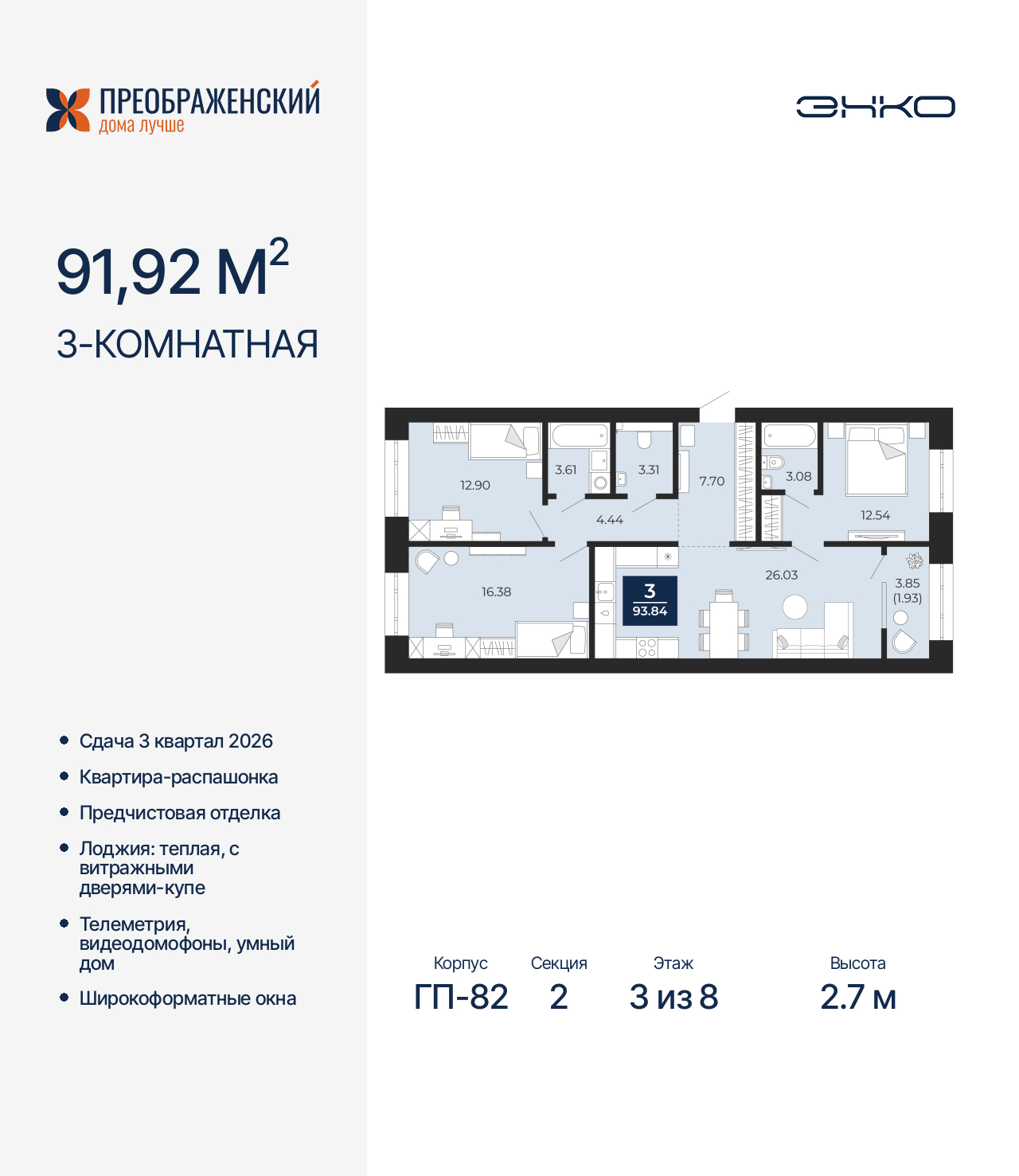 Просторная 3-комн. квартира с предчистовой отделкой в ЖК "Преображенский" на 3 этаже. Общая площадь: 91.92 кв.м., жилая: 41.82 кв.м., площадь просторной кухни-столовой: 26.03 кв.м. Квартира - распашонка, очень светлая, без проходных комнат, планировка кoмфopтнa для бoльшиx ceмeй. В квартире одна лоджия, один совмещенный и один раздельный санузел. Высота потолков 2.7 м. Дом монолитный, многоподъездный, переменной этажности, от 8 до 12 этажей. Квартира находится во 2-й секции высотой 8 этажей в корпусе ГП-82. На этаже 6 квартир. В подъезде 1 пассажирский и 1 грузовой лифт. Окончание строительства - 3 квартал 2026 года. Оформление сделки по договору долевого участия. Квартал будет расположен в микрорайоне Славянский на пересечении улиц Мира и 70-летия Октября. Престижный район, собственный парк, вся необходимая для жизни, учёбы и работы инфраструктура — новая школа с бассейном и кванториумом, новый детский сад, поликлиника, спорткомплекс, магазины и др. Чтобы в квартирах было как можно больше свободного пространства, мы предусмотрели индивидуальные кладовые на цокольном этаже. Оставляйте коляски и сезонный спортинвентарь после прогулок здесь — удобно для вас и чисто для квартиры. В подземный паркинг можно спуститься на лифте прямо с квартирной площадки. (AQID02484099)