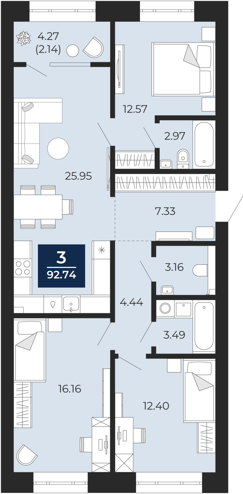 Просторная 3-комн. квартира с предчистовой отделкой в ЖК "Преображенский" на 5 этаже. Общая площадь: 90.61 кв.м., жилая: 41.13 кв.м., площадь просторной кухни-столовой: 25.95 кв.м. Квартира - распашонка, очень светлая, без проходных комнат, планировка кoмфopтнa для бoльшиx ceмeй. В квартире одна лоджия, один совмещенный и один раздельный санузел. Высота потолков 2.7 м. Дом монолитный, многоподъездный, переменной этажности, от 8 до 12 этажей. Квартира находится в 4-й секции высотой 12 этажей в корпусе ГП-83. На этаже 6 квартир. В подъезде 1 пассажирский и 1 грузовой лифт. Начало строительства - 4 квартал 2023 года. Окончание строительства - 3 квартал 2026 года. Оформление сделки по договору долевого участия. Квартал будет расположен в микрорайоне Славянский на пересечении улиц Мира и 70-летия Октября. Престижный район, собственный парк, вся необходимая для жизни, учёбы и работы инфраструктура — новая школа с бассейном и кванториумом, новый детский сад, поликлиника, спорткомплекс, магазины и др. Чтобы в квартирах было как можно больше свободного пространства, мы предусмотрели индивидуальные кладовые на цокольном этаже. Оставляйте коляски и сезонный спортинвентарь после прогулок здесь — удобно для вас и чисто для квартиры. В подземный паркинг можно спуститься на лифте прямо с квартирной площадки. (AQID02484225)