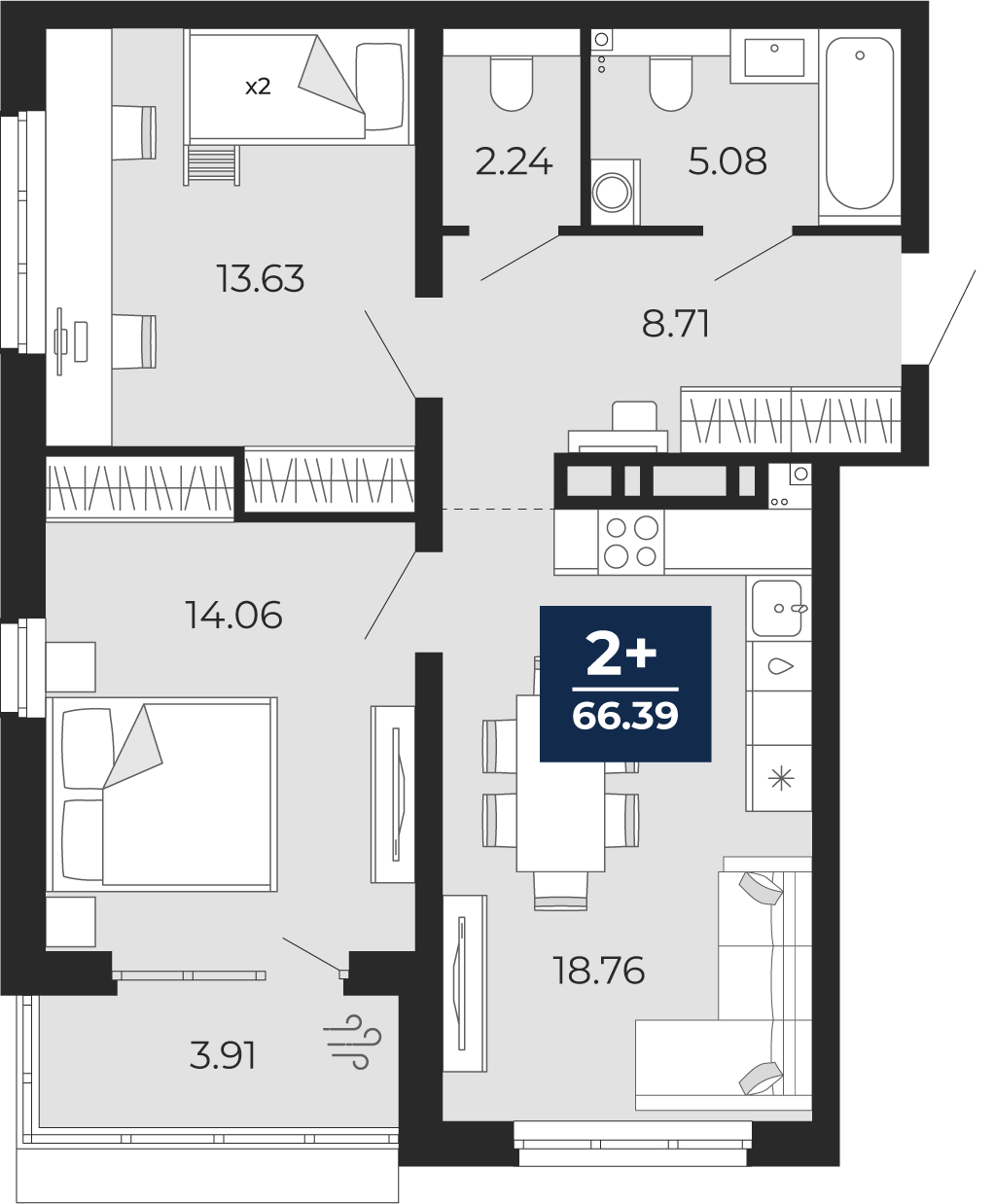 Квартира 2-комн., 64 м2, 2/12 этаж,