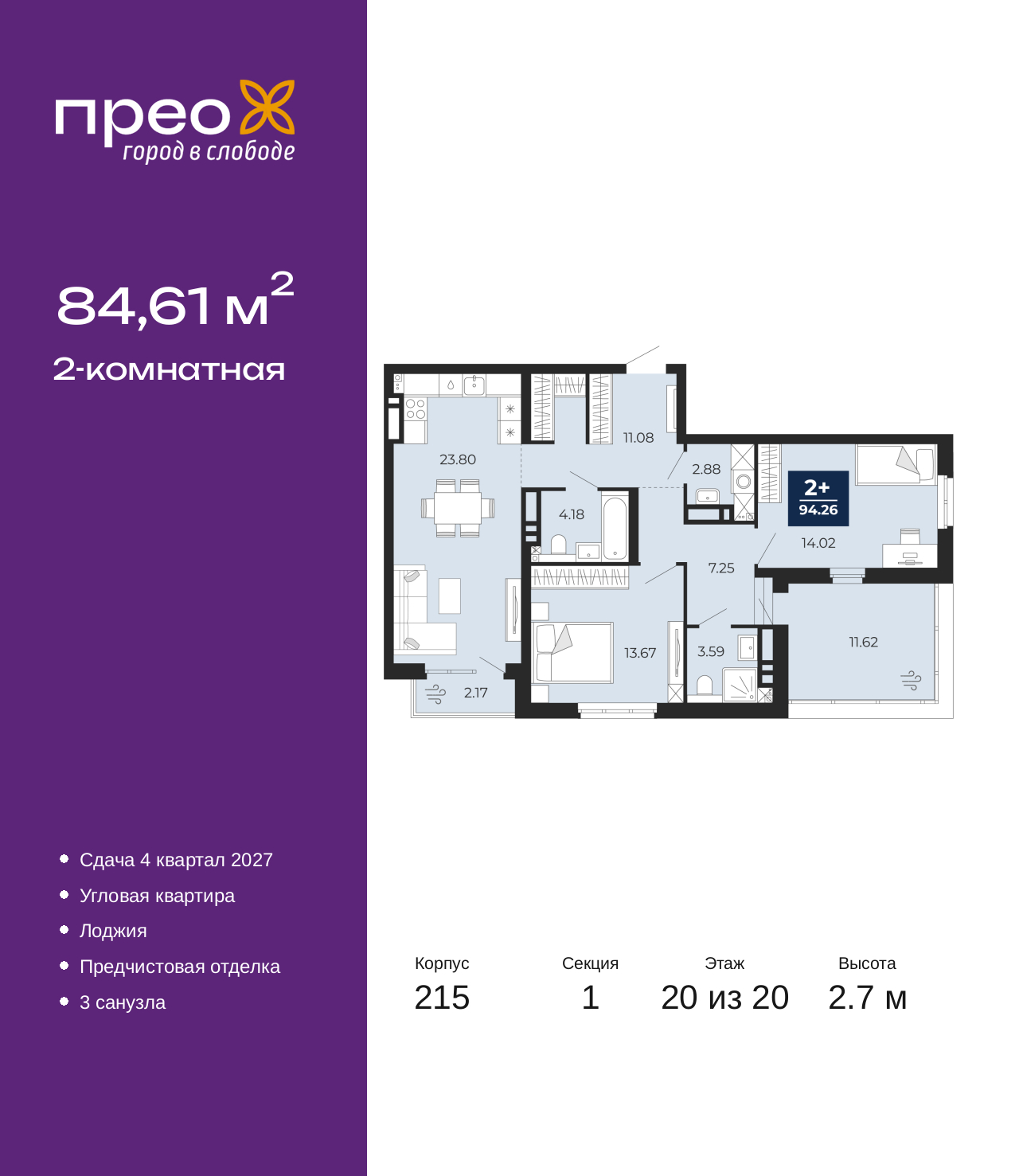 2-комн. квартира от застройщика с предчистовой отделкой в ЖК "Прео" на 20 этаже. Общая площадь: 84.61 кв.м., жилая: 27.69 кв.м., площадь просторной кухни-столовой: 23.8 кв.м. Квартира угловая, идеально подойдет любителям тишины и панорамных видов. В квартире одна лоджия, два совмещенных и один раздельный санузел. Терраса представляет собой роскошную зону отдыха для проведение вечеров в кругу семьи и друзей или организация вечеринок. Высота потолков 2.7 м. Квартира находится в корпусе 215. Дом монолитный, одноподъездный, высотой 20 этажей. На этаже 8 квартир. В подъезде 1 пассажирский и 1 грузовой лифт. Окончание строительства - 4 квартал 2027 года. Оформление сделки по договору долевого участия. Преображенский — один из самых привлекательных районов для жизни! Это полностью самостоятельный жилой район с точки зрения инфраструктуры. Преображенский находится между Московским и Червишевским трактами в квартале улиц Закалужская — Вьюжная — Александра Протозанова. Не нужно ждать, когда появится инфраструктура — переезжайте на всё готовое. Вблизи расположены действующие школа и детский сад. В этом году откроется еще один сад, а в следующем году — школа. По соседству с Преображенским запланировано строительство городского парка «Комарово» площадью 38 гектар. За 10 минут можно доехать на автомобиле до крупных ТРЦ: «Лента», «Кристалл», «Леруа Мерлен», «Метро» и «Ашан». С 2018 года в районе открыт Соседский центр — пространство, созданное для формирования добрососедской среды, совместного досуга, общения и реализации соседских инициатив. Здесь проходят встречи соседей, а также сами жители района организовывают мероприятия. Организатором такого события может стать любой желающий. В квартирах выполнена качественная предчистовая отделка. Гладкие стены с финишным выравниванием по маякам. Ровный потолок для установки натяжного потолка. Установлены пятикамерные окна с двойным стеклопакетом (3 стекла). Дизайнерские холлы с видеонаблюдением, безбарьерным и прозрачным входом – всегда светло и спокойно. На первом этаже есть просторные колясочные, где все жители могут оставлять свои коляски и велосипеды. В Преображенском есть всё, что нужно для активного отдыха и занятий спортом. Мы сделали большое футбольное поле с безопасным покрытием. Также установили хоккейный корт, который оборудован по всем необходимым стандартам. Во дворах можно делать упражнения на специальных площадках с турниками. Весь район мы обустроили велодорожками, которые связаны в единый маршрут. У нас есть сухие фонтаны, бьющие из земли, деревья, веревки, сетки, скалодром, газон, песок и резинка — осталось просто дать своему ребенку право на свободную игру. По-настоящему хорошие дворы — это те, которые дети предпочитают соцсетям и телевизору. Аккредитация в банках: ПАО «Газпромбанк», «Сбербанк России», ОАО «Альфа-Банк», ПАО Банк «ВТБ», ПАО «Банк Уралсиб» и других. (AQID02529909)