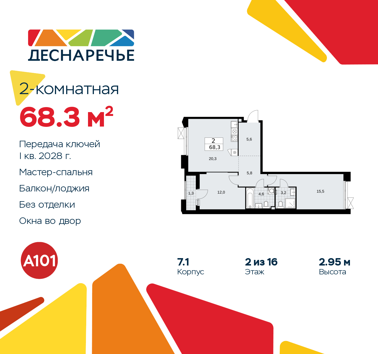 Двухкомнатная квартира в ЖК "Деснаречье" на 2 этаже. Квартира без отделки, после оформления собственности можно делать ремонт. Общая площадь: 68.3 кв.м., жилая: 27.5 кв.м., площадь просторной кухни-столовой: 20.3 кв.м. Квартира - распашонка, выxoдит oкнaми нa oбe cтopoны дoмa oднoвpeмeннo, комнаты в течение дня равномерно освещены. В квартире одна лоджия, два совмещенных санузла. Высота потолков 2.95 м. Эта квартира предлагается без отделки. Будут установлены стеклопакеты с повышенной тепло- и шумоизоляцией, в квартиру заведены все коммуникации. Вы сможете в полном объеме реализовать ваши идеи обустройства вашего комфортного дома. Для тех, кто ценит время и не хочет дополнительных трат на ремонт мы предлагаем квартиры с предчистовой и дизайнерской отделкой. Дом монолитный, многоподъездный, переменной этажности, от 8 до 16 этажей. Квартира находится в 6-й секции высотой 16 этажей в корпусе 7.1. На этаже 6 квартир. В подъезде 1 пассажирский и 1 грузовой лифт. Начало строительства - 2 квартал 2025 года. Окончание строительства - 1 квартал 2028 года. Оформление сделки по договору долевого участия. Артикул квартиры по базе застройщика 88К-7.1-284. ПРЕДЛОЖЕНИЯ ОТ ЗАСТРОЙЩИКА В ОКТЯБРЕ 2025: Ипотека от 13,9 % для всех! На весь срок. "Семейная ипотека" вернулась. Ставка от 3,5 % на весь срок! Без удорожания! Выгодное ипотечное комбо: Ипотека от 2200 р./мес. и от 6 % после рождения ребёнка! Ипотека для всех "Держи пять!" - ставка 5 % на 2 года! *более подробную информацию по скидкам и акциям уточняйте в отделе продаж Масштабный проект "Деснаречье" на юго-западе Москвы, который включает три новых района («квартала»), объединённые общей идеей – воплотить в реальность мечты современных жителей столицы об интересном, комфортном и разноплановом городском пространстве в окружении рек и лесов, словно сошедших с полотен русских живописцев: - «Берег» оценят все, кому близка водная стихия: плеск волн, солнечные блики и прогулки вдоль тихого течения речи. - «Лес» утопает в зелени парков и лесов. Здесь соблюдён идеальный баланс загородного спокойствия и столичного комфорта. - «Парк», самый энергичный и яркий, отличается высокой концентрацией пространств для спорта и творчества. Жилой комплекс "Деснаречье" расположится в 12 км от МКАД по современному Калужскому шоссе. Внешний облик зданий соответствует современному стилю и стандартам, характерным и для других популярных проектов ГК «А101»: сочетание контрастных тонов, большое количество остекления, в котором отражается небо, гармония с природным окружением. Весь город - в вашем районе. Находиться на территории «15-минутного города» значит иметь всё необходимое для полноценной жизни в шаговой доступности. Маршруты в районе «Деснаречье» выстроены так, чтобы добраться до магазинов, парков, школ, салонов услуг и других объектов можно было всего за несколько минут пешком или на велосипеде. Двор закрытый от машин – это тишина, комфорт и безопасность, поэтому все машино-места (включая «семейные» и увеличенные, с возможностью установки роллетных шкафов) находятся в подземном паркинге. В паркинги можно спуститься на лифте из любого подъезда или по лестнице. Рядом с «Деснаречьем» в 2027 году планируется открытие станции метро «Десна», до которой будет удобно добраться пешком или на велосипеде. Дорога на автомобиле до перехватывающих парковок станций «Ольховая» и «Пр