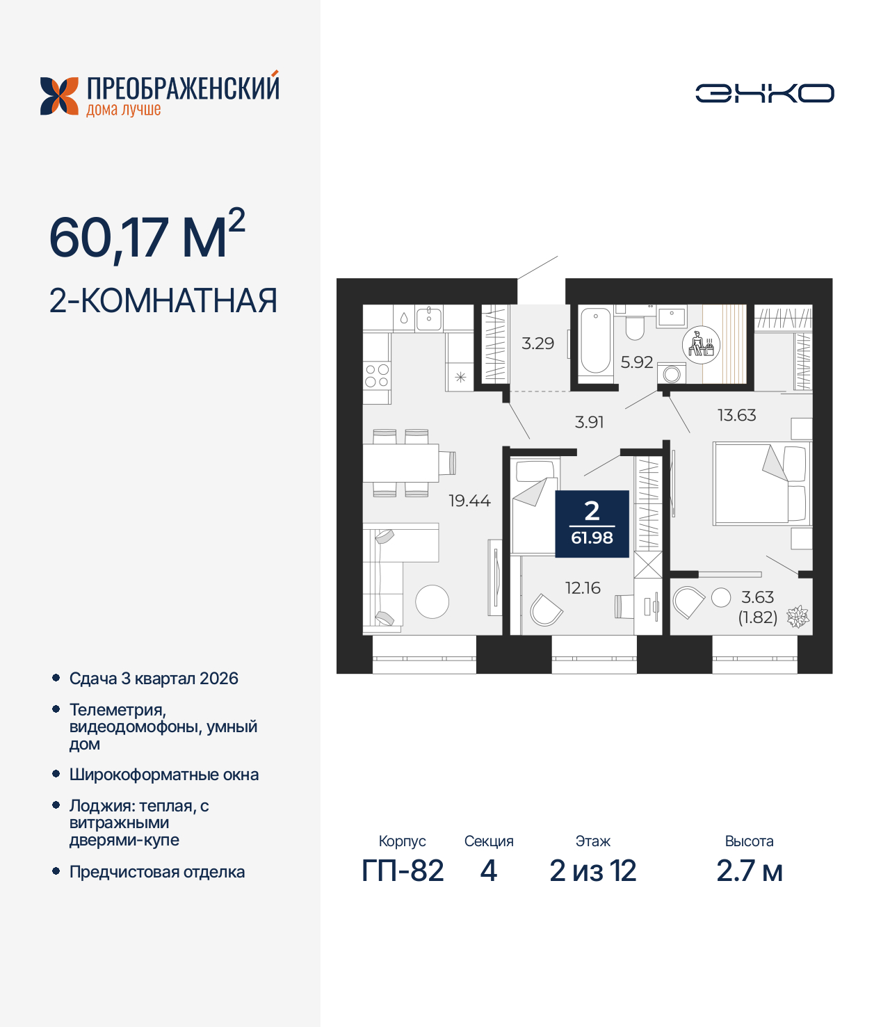 Двухкомнатная квартира с предчистовой отделкой в ЖК "Преображенский" на 2 этаже. Общая площадь: 60.17 кв.м., жилая: 25.79 кв.м., площадь просторной кухни-столовой: 19.44 кв.м. Комнаты изолированные, все окна выходят на одну сторону. В квартире одна лоджия, один совмещенный санузел. Высота потолков 2.7 м. Дом монолитный, многоподъездный, переменной этажности, от 8 до 12 этажей. Квартира находится в 4-й секции высотой 12 этажей в корпусе ГП-82. На этаже 6 квартир. В подъезде 1 пассажирский и 1 грузовой лифт. Окончание строительства - 3 квартал 2026 года. Оформление сделки по договору долевого участия. Квартал будет расположен в микрорайоне Славянский на пересечении улиц Мира и 70-летия Октября. Престижный район, собственный парк, вся необходимая для жизни, учёбы и работы инфраструктура — новая школа с бассейном и кванториумом, новый детский сад, поликлиника, спорткомплекс, магазины и др. Чтобы в квартирах было как можно больше свободного пространства, мы предусмотрели индивидуальные кладовые на цокольном этаже. Оставляйте коляски и сезонный спортинвентарь после прогулок здесь — удобно для вас и чисто для квартиры. В подземный паркинг можно спуститься на лифте прямо с квартирной площадки. (AQID02484138)