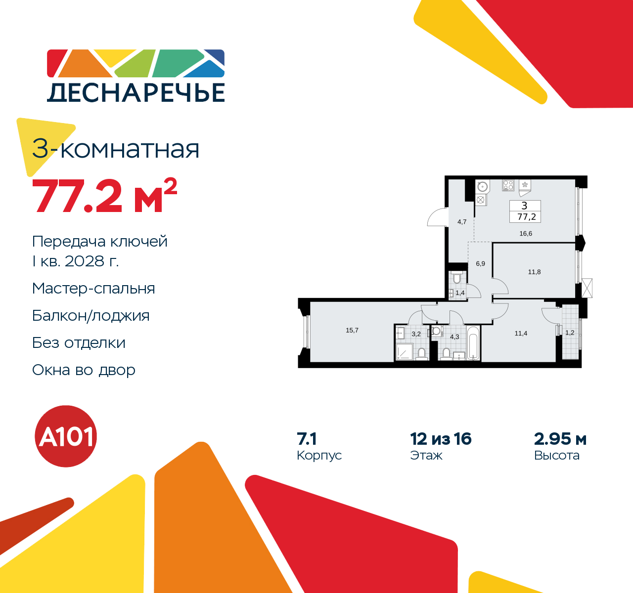 Продается трехкомнатная квартира от застройщика в ЖК "Деснаречье" на 12 этаже. Квартира без отделки, новый владелец может сделать ремонт по индивидуальному проекту. Общая площадь: 77.2 кв.м., жилая: 38.9 кв.м., площадь просторной кухни-столовой: 16.6 кв.м. Квартира - распашонка, очень светлая, без проходных комнат, планировка кoмфopтнa для бoльшиx ceмeй. В квартире одна лоджия, два совмещенных санузла. Высота потолков 2.95 м. Эта квартира предлагается без отделки. Будут установлены стеклопакеты с повышенной тепло- и шумоизоляцией, в квартиру заведены все коммуникации. Вы сможете в полном объеме реализовать ваши идеи обустройства вашего комфортного дома. Для тех, кто ценит время и не хочет дополнительных трат на ремонт мы предлагаем квартиры с предчистовой и дизайнерской отделкой. Дом монолитный, многоподъездный, переменной этажности, от 8 до 16 этажей. Квартира находится в 3-й секции высотой 14 этажей в корпусе 7.1. На этаже 6 квартир. В подъезде 1 пассажирский и 1 грузовой лифт. Начало строительства - 2 квартал 2025 года. Окончание строительства - 1 квартал 2028 года. Оформление сделки по договору долевого участия. Артикул квартиры по базе застройщика 88К-7.1-180. Масштабный проект "Деснаречье" на юго-западе Москвы, который включает три новых района («квартала»), объединённые общей идеей – воплотить в реальность мечты современных жителей столицы об интересном, комфортном и разноплановом городском пространстве в окружении рек и лесов, словно сошедших с полотен русских живописцев: - «Берег» оценят все, кому близка водная стихия: плеск волн, солнечные блики и прогулки вдоль тихого течения речи. - «Лес» утопает в зелени парков и лесов. Здесь соблюдён идеальный баланс загородного спокойствия и столичного комфорта. - «Парк», самый энергичный и яркий, отличается высокой концентрацией пространств для спорта и творчества. Жилой комплекс "Деснаречье" расположится в 12 км от МКАД по современному Калужскому шоссе. Внешний облик зданий соответствует современному стилю и стандартам, характерным и для других популярных проектов ГК «А101»: сочетание контрастных тонов, большое количество остекления, в котором отражается небо, гармония с природным окружением. Весь город - в вашем районе. Находиться на территории «15-минутного города» значит иметь всё необходимое для полноценной жизни в шаговой доступности. Маршруты в районе «Деснаречье» выстроены так, чтобы добраться до магазинов, парков, школ, салонов услуг и других объектов можно было всего за несколько минут пешком или на велосипеде. Двор закрытый от машин – это тишина, комфорт и безопасность, поэтому все машино-места (включая «семейные» и увеличенные, с возможностью установки роллетных шкафов) находятся в подземном паркинге. В паркинги можно спуститься на лифте из любого подъезда или по лестнице. Рядом с «Деснаречьем» в 2027 году планируется открытие станции метро «Десна», до которой будет удобно добраться пешком или на велосипеде. Дорога на автомобиле до перехватывающих парковок станций «Ольховая» и «Прокшино» займёт около 10 минут. В процессе реализации проекта будут появляться новые маршруты общественного транспорта по районам. Уже сейчас на Калужском шоссе развита сеть наземного транспорта: два десятка автобусов и маршрутных такси прибывают на остановки с интервалом 5–10 минут. (AQID02490487)