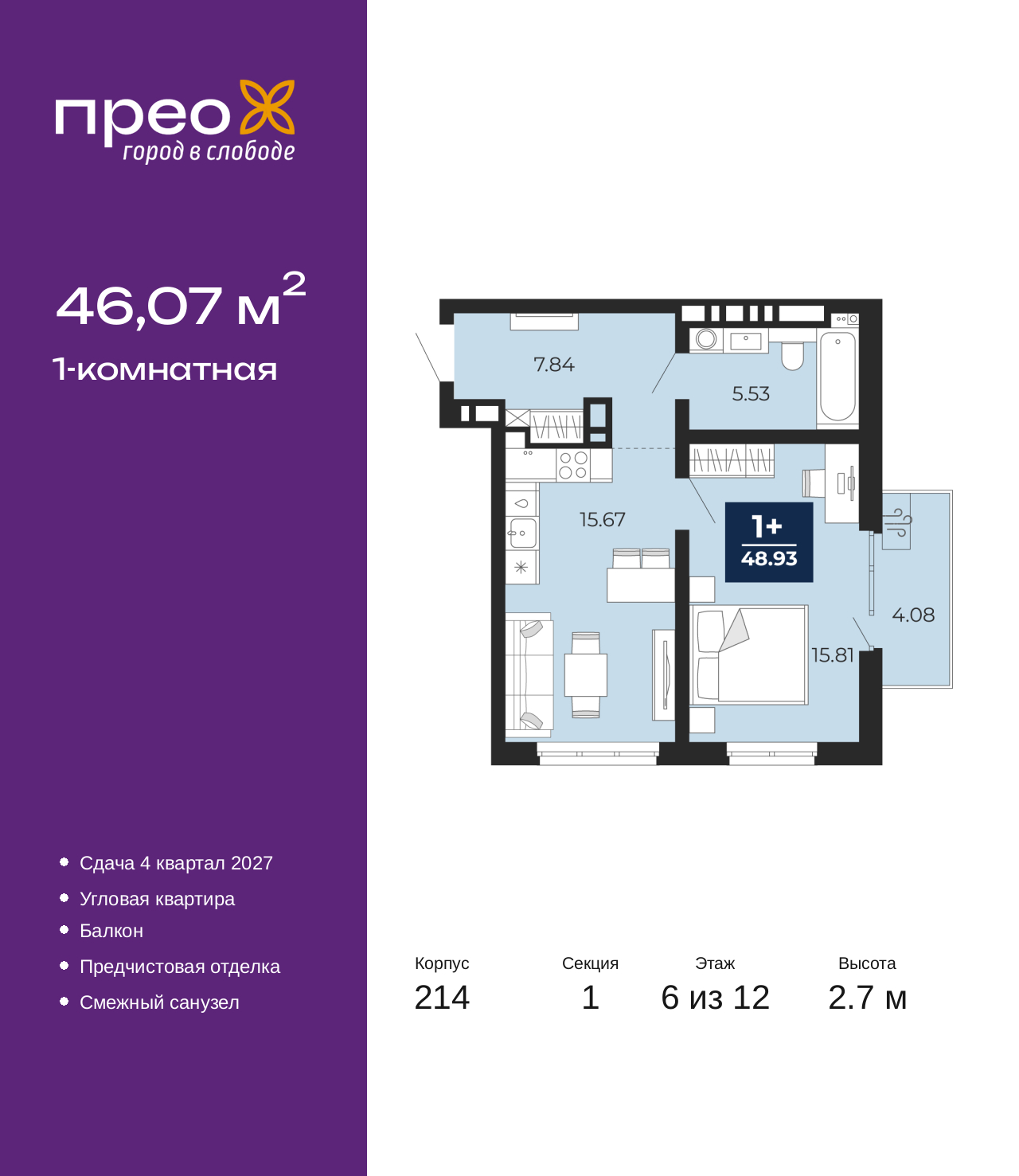 Продается однокомнатная квартира от застройщика с предчистовой отделкой в ЖК "Прео" на 6 этаже. Общая площадь: 46.07 кв.м., жилая: 15.81 кв.м., площадь просторной кухни-столовой: 15.67 кв.м. Квартира угловая, окна oбecпeчивaют paвнoмepнoe ocвeщeниe в тeчeниe дня. В квартире один балкон, один совмещенный санузел. Высота потолков 2.7 м. Дом монолитный, двухподъездный, переменной этажности, от 12 до 20 этажей. Квартира находится в 1-й секции высотой 12 этажей в корпусе 214. На этаже 8 квартир. В подъезде 1 пассажирский и 1 грузовой лифт. Окончание строительства - 4 квартал 2027 года. Оформление сделки по договору долевого участия. Преображенский — один из самых привлекательных районов для жизни! Это полностью самостоятельный жилой район с точки зрения инфраструктуры. Преображенский находится между Московским и Червишевским трактами в квартале улиц Закалужская — Вьюжная — Александра Протозанова. Не нужно ждать, когда появится инфраструктура — переезжайте на всё готовое. Вблизи расположены действующие школа и детский сад. В этом году откроется еще один сад, а в следующем году — школа. По соседству с Преображенским запланировано строительство городского парка «Комарово» площадью 38 гектар. За 10 минут можно доехать на автомобиле до крупных ТРЦ: «Лента», «Кристалл», «Леруа Мерлен», «Метро» и «Ашан». С 2018 года в районе открыт Соседский центр — пространство, созданное для формирования добрососедской среды, совместного досуга, общения и реализации соседских инициатив. Здесь проходят встречи соседей, а также сами жители района организовывают мероприятия. Организатором такого события может стать любой желающий. В квартирах выполнена качественная предчистовая отделка. Гладкие стены с финишным выравниванием по маякам. Ровный потолок для установки натяжного потолка. Установлены пятикамерные окна с двойным стеклопакетом (3 стекла). Дизайнерские холлы с видеонаблюдением, безбарьерным и прозрачным входом – всегда светло и спокойно. На первом этаже есть просторные колясочные, где все жители могут оставлять свои коляски и велосипеды. В Преображенском есть всё, что нужно для активного отдыха и занятий спортом. Мы сделали большое футбольное поле с безопасным покрытием. Также установили хоккейный корт, который оборудован по всем необходимым стандартам. Во дворах можно делать упражнения на специальных площадках с турниками. Весь район мы обустроили велодорожками, которые связаны в единый маршрут. У нас есть сухие фонтаны, бьющие из земли, деревья, веревки, сетки, скалодром, газон, песок и резинка — осталось просто дать своему ребенку право на свободную игру. По-настоящему хорошие дворы — это те, которые дети предпочитают соцсетям и телевизору. Аккредитация в банках: ПАО Банк «ВТБ», ПАО «Газпромбанк», «Сбербанк России», ОАО «Альфа-Банк», ПАО «Банк Уралсиб» и других. (AQID02525501)