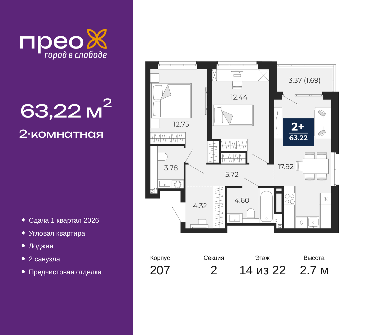 - Общая площадь 63.22 м²