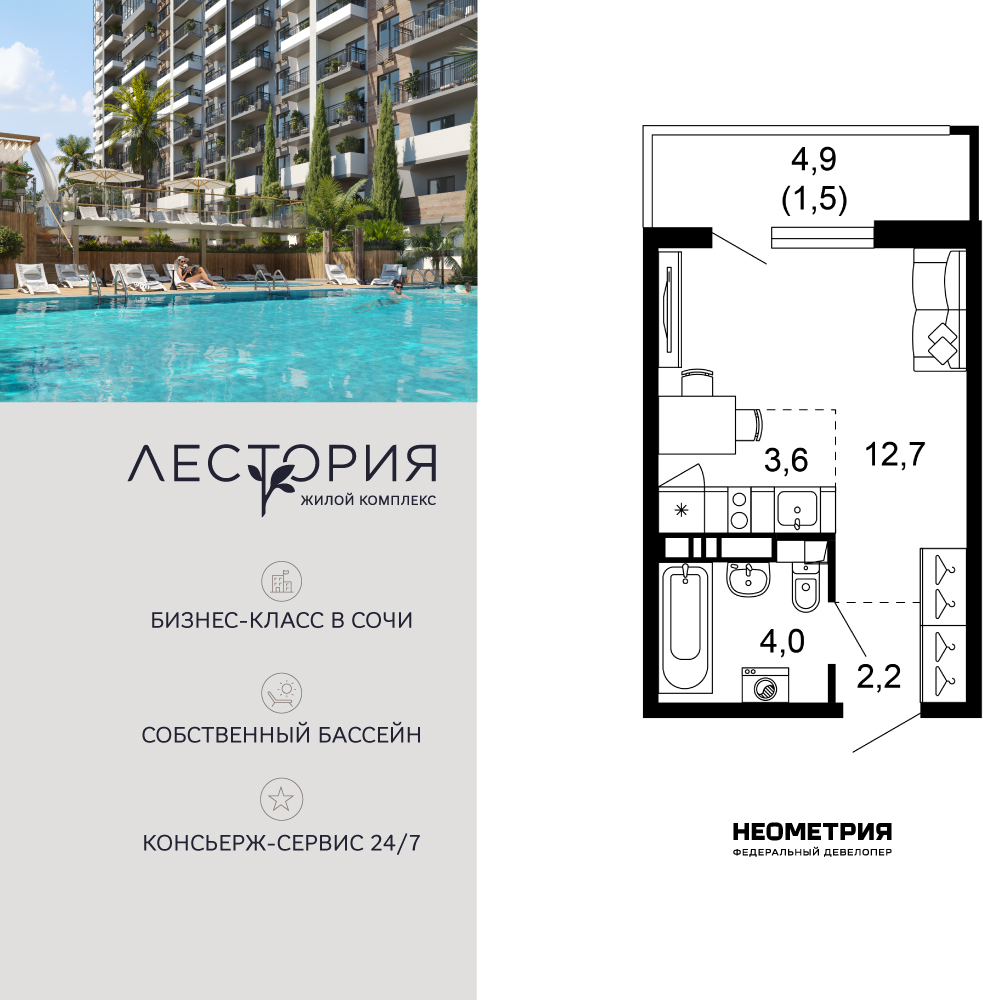 Продается квартира в жилом комплексе бизнес-класса «Лестория». В составе ЖК предусмотрена собственная аквазона площадью 473 квадратных метра с двумя подогреваемыми бассейнами, что соответствуют стандартам бизнес-класса. Аквазона объединяет взрослый и детский бассейны. В welcome-zone к услугам посетителей шезлонги и все необходимые принадлежности. Раздевалки с душевыми комнатами, инфракрасная сауна — здесь все предусмотрено для комфортного отдыха и полного расслабления. Для водного комплекса продуман отдельный вход, оборудованный системой контроля и управления доступом (СКУД). Аквазона – только часть уникальной инфраструктуры «Лестории», которая включает в себя также благоустроенную территорию с пятьюдесятью функциональными зонами для прогулок, отдыха и занятий спортом, видовые террасы на крышах для отдыха, работы и встреч с друзьями, а также пространство набережной Кудепсты с шезлонгами и перголами. Жилой комплекс «Лестория» состоит из шести домов высотностью от 15 до 17 этажей, окружённых зеленым массивом национального парка. На придомовой территории для жителей предусмотрены закрытые дворы с круглосуточным видеонаблюдением, активити-центр для детей и подростков, тихие зоны для отдыха и медитации. На крышах домов будут созданы зеленые террасы для наслаждения прекрасными видами на море и горы. В проекте предусмотрены разные варианты отделки квартир под потребности покупателей. Тем, кто хочет воплотить в жизнь собственные интерьерные задумки, подойдут квартиры без ремонта. Для комфортной жизни и отдыха в комплексе будет работать круглосуточный консьерж-сервис уровня 5*, который с легкостью закроет все ежедневные потребности: от заказа продуктов и встречи гостей в аэропорту до выгула и дрессировки питомца. К услугам жителей ЖК «Лестория» — собственная управляющая компания, для инвесторов предоставляются услуги доверительного управления. (AQID02539361)