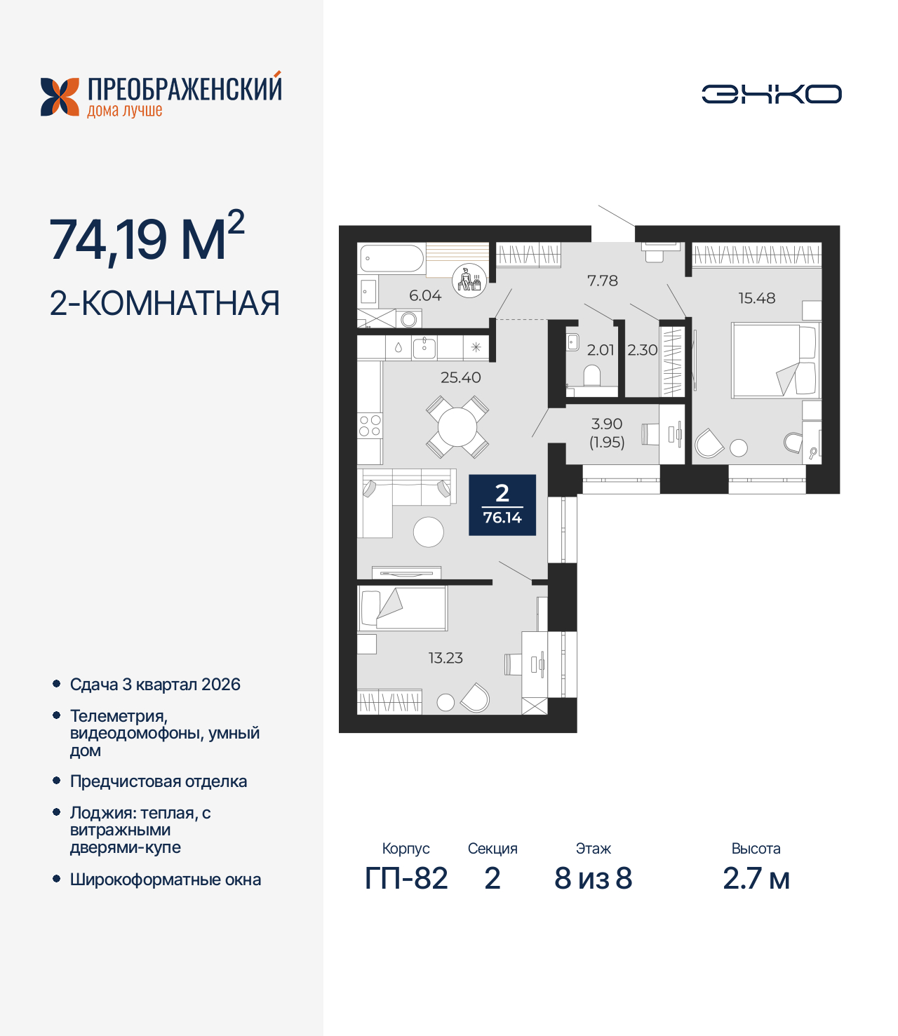 2-комн. квартира с предчистовой отделкой в ЖК "Преображенский" на 8 этаже. Общая площадь: 74.19 кв.м., жилая: 28.71 кв.м., площадь просторной кухни-столовой: 25.4 кв.м. Квартира угловая, идеально подойдет любителям тишины и панорамных видов. В квартире одна лоджия, один раздельный санузел. Высота потолков 2.7 м. Дом монолитный, многоподъездный, переменной этажности, от 8 до 12 этажей. Квартира находится во 2-й секции высотой 8 этажей в корпусе ГП-82. На этаже 6 квартир. В подъезде 1 пассажирский и 1 грузовой лифт. Окончание строительства - 3 квартал 2026 года. Оформление сделки по договору долевого участия. Квартал будет расположен в микрорайоне Славянский на пересечении улиц Мира и 70-летия Октября. Престижный район, собственный парк, вся необходимая для жизни, учёбы и работы инфраструктура — новая школа с бассейном и кванториумом, новый детский сад, поликлиника, спорткомплекс, магазины и др. Чтобы в квартирах было как можно больше свободного пространства, мы предусмотрели индивидуальные кладовые на цокольном этаже. Оставляйте коляски и сезонный спортинвентарь после прогулок здесь — удобно для вас и чисто для квартиры. В подземный паркинг можно спуститься на лифте прямо с квартирной площадки. (AQID02484104)