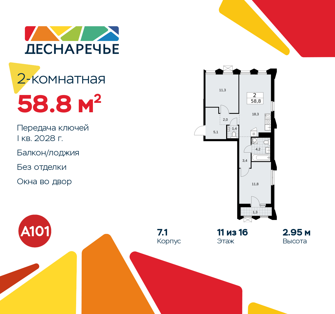 Просторная 2-комн. квартира в ЖК "Деснаречье" на 11 этаже. Квартира без отделки, новый владелец может сделать ремонт по индивидуальному дизайн-проекту. Общая площадь: 58.8 кв.м., жилая: 23.1 кв.м., площадь просторной кухни-столовой: 18.3 кв.м. Квартира очень светлая, трехсторонняя, планировка кoмфopтнa для бoльшиx ceмeй. В квартире одна лоджия, один совмещенный и один раздельный санузел. Высота потолков 2.95 м. Эта квартира предлагается без отделки. Будут установлены стеклопакеты с повышенной тепло- и шумоизоляцией, в квартиру заведены все коммуникации. Вы сможете в полном объеме реализовать ваши идеи обустройства вашего комфортного дома. Для тех, кто ценит время и не хочет дополнительных трат на ремонт мы предлагаем квартиры с предчистовой и дизайнерской отделкой. Дом монолитный, многоподъездный, переменной этажности, от 8 до 16 этажей. Квартира находится в 4-й секции высотой 11 этажей в корпусе 7.1. На этаже 5 квартир. В подъезде 1 пассажирский и 1 грузовой лифт. Начало строительства - 2 квартал 2025 года. Окончание строительства - 1 квартал 2028 года. Оформление сделки по договору долевого участия. Артикул квартиры по базе застройщика 88К-7.1-239. Масштабный проект "Деснаречье" на юго-западе Москвы, который включает три новых района («квартала»), объединённые общей идеей – воплотить в реальность мечты современных жителей столицы об интересном, комфортном и разноплановом городском пространстве в окружении рек и лесов, словно сошедших с полотен русских живописцев: - «Берег» оценят все, кому близка водная стихия: плеск волн, солнечные блики и прогулки вдоль тихого течения речи. - «Лес» утопает в зелени парков и лесов. Здесь соблюдён идеальный баланс загородного спокойствия и столичного комфорта. - «Парк», самый энергичный и яркий, отличается высокой концентрацией пространств для спорта и творчества. Жилой комплекс "Деснаречье" расположится в 12 км от МКАД по современному Калужскому шоссе. Внешний облик зданий соответствует современному стилю и стандартам, характерным и для других популярных проектов ГК «А101»: сочетание контрастных тонов, большое количество остекления, в котором отражается небо, гармония с природным окружением. Весь город - в вашем районе. Находиться на территории «15-минутного города» значит иметь всё необходимое для полноценной жизни в шаговой доступности. Маршруты в районе «Деснаречье» выстроены так, чтобы добраться до магазинов, парков, школ, салонов услуг и других объектов можно было всего за несколько минут пешком или на велосипеде. Двор закрытый от машин – это тишина, комфорт и безопасность, поэтому все машино-места (включая «семейные» и увеличенные, с возможностью установки роллетных шкафов) находятся в подземном паркинге. В паркинги можно спуститься на лифте из любого подъезда или по лестнице. Рядом с «Деснаречьем» в 2027 году планируется открытие станции метро «Десна», до которой будет удобно добраться пешком или на велосипеде. Дорога на автомобиле до перехватывающих парковок станций «Ольховая» и «Прокшино» займёт около 10 минут. В процессе реализации проекта будут появляться новые маршруты общественного транспорта по районам. Уже сейчас на Калужском шоссе развита сеть наземного транспорта: два десятка автобусов и маршрутных такси прибывают на остановки с интервалом 5–10 минут. (AQID02490544)