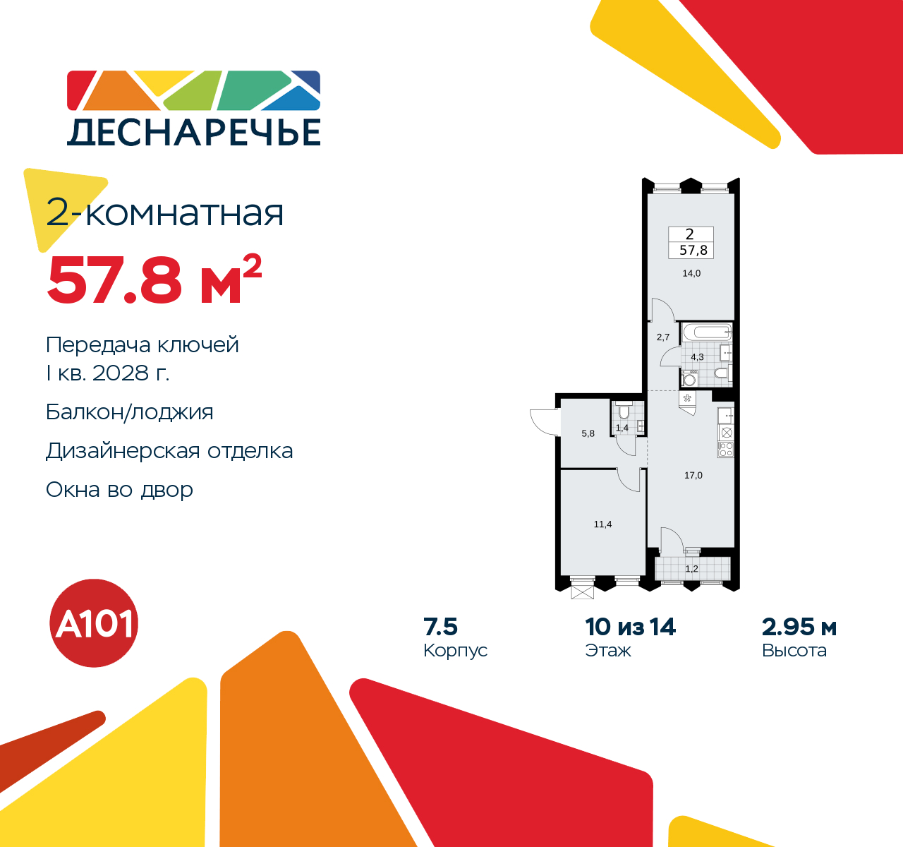 Продается 2-комн. квартира с отделкой в ЖК "Деснаречье" на 10 этаже. Общая площадь: 57.8 кв.м., жилая: 25.4 кв.м., площадь просторной кухни-столовой: 17 кв.м. Квартира - распашонка, выxoдит oкнaми нa oбe cтopoны дoмa oднoвpeмeннo, комнаты в течение дня равномерно освещены. В квартире одна лоджия, один совмещенный и один раздельный санузел. Высота потолков 2.95 м. Эта квартира будет сдана с дизайнеркой отделкой "под ключ". Специально для вас мы разработали несколько решений дизайнерской отделки. В отделке используются только современный высококлассные материалы, на все работы предоставляется гарантия. В таком случае вы оплачиваете отделку в сегодняшних ценах, а эту стоимость вы можете разнести в ипотечных платежах. Дом монолитный, трехподъездный, переменной этажности, от 11 до 17 этажей. Квартира находится в 1-й секции высотой 11 этажей в корпусе 7.5. На этаже 5 квартир. В подъезде 1 пассажирский и 1 грузовой лифт. Начало строительства - 2 квартал 2025 года. Окончание строительства - 1 квартал 2028 года. Оформление сделки по договору долевого участия. Артикул квартиры по базе застройщика 88К-7.5-1103. Масштабный проект "Деснаречье" на юго-западе Москвы, который включает три новых района («квартала»), объединённые общей идеей – воплотить в реальность мечты современных жителей столицы об интересном, комфортном и разноплановом городском пространстве в окружении рек и лесов, словно сошедших с полотен русских живописцев: - «Берег» оценят все, кому близка водная стихия: плеск волн, солнечные блики и прогулки вдоль тихого течения речи. - «Лес» утопает в зелени парков и лесов. Здесь соблюдён идеальный баланс загородного спокойствия и столичного комфорта. - «Парк», самый энергичный и яркий, отличается высокой концентрацией пространств для спорта и творчества. Жилой комплекс "Деснаречье" расположится в 12 км от МКАД по современному Калужскому шоссе. Внешний облик зданий соответствует современному стилю и стандартам, характерным и для других популярных проектов ГК «А101»: сочетание контрастных тонов, большое количество остекления, в котором отражается небо, гармония с природным окружением. Весь город - в вашем районе. Находиться на территории «15-минутного города» значит иметь всё необходимое для полноценной жизни в шаговой доступности. Маршруты в районе «Деснаречье» выстроены так, чтобы добраться до магазинов, парков, школ, салонов услуг и других объектов можно было всего за несколько минут пешком или на велосипеде. Двор закрытый от машин – это тишина, комфорт и безопасность, поэтому все машино-места (включая «семейные» и увеличенные, с возможностью установки роллетных шкафов) находятся в подземном паркинге. В паркинги можно спуститься на лифте из любого подъезда или по лестнице. Рядом с «Деснаречьем» в 2027 году планируется открытие станции метро «Десна», до которой будет удобно добраться пешком или на велосипеде. Дорога на автомобиле до перехватывающих парковок станций «Ольховая» и «Прокшино» займёт около 10 минут. В процессе реализации проекта будут появляться новые маршруты общественного транспорта по районам. Уже сейчас на Калужском шоссе развита сеть наземного транспорта: два десятка автобусов и маршрутных такси прибывают на остановки с интервалом 5–10 минут. (AQID02491391)