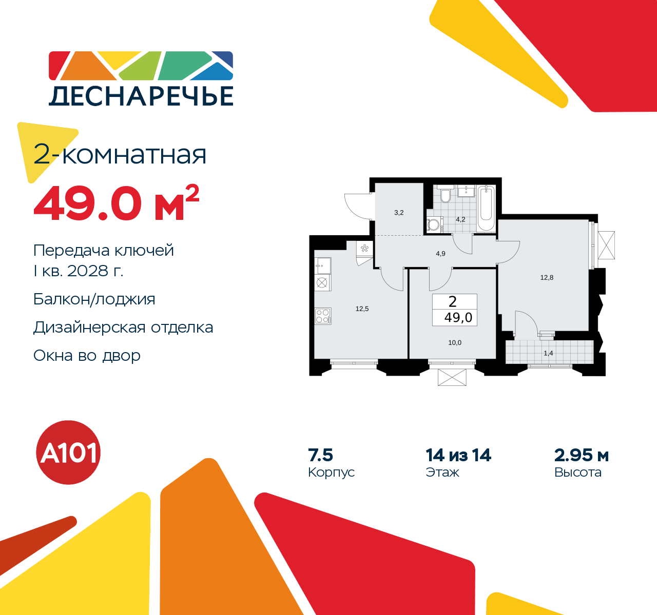 Просторная двухкомнатная квартира с отделкой в ЖК "Деснаречье" на 14 этаже. Общая площадь: 49 кв.м., жилая: 22.8 кв.м., площадь просторной кухни-столовой: 12.5 кв.м. Квартира угловая, окна oбecпeчивaют paвнoмepнoe ocвeщeниe в тeчeниe дня. В квартире одна лоджия, один совмещенный санузел. Высота потолков 2.95 м. Эта квартира будет сдана с дизайнеркой отделкой "под ключ". Специально для вас мы разработали несколько решений дизайнерской отделки. В отделке используются только современный высококлассные материалы, на все работы предоставляется гарантия. В таком случае вы оплачиваете отделку в сегодняшних ценах, а эту стоимость вы можете разнести в ипотечных платежах. Дом монолитный, трехподъездный, переменной этажности, от 11 до 17 этажей. Квартира находится в 3-й секции высотой 14 этажей в корпусе 7.5. На этаже 5 квартир. В подъезде 1 пассажирский и 1 грузовой лифт. Начало строительства - 2 квартал 2025 года. Окончание строительства - 1 квартал 2028 года. Оформление сделки по договору долевого участия. Артикул квартиры по базе застройщика 88К-7.5-1213. Масштабный проект "Деснаречье" на юго-западе Москвы, который включает три новых района («квартала»), объединённые общей идеей – воплотить в реальность мечты современных жителей столицы об интересном, комфортном и разноплановом городском пространстве в окружении рек и лесов, словно сошедших с полотен русских живописцев: - «Берег» оценят все, кому близка водная стихия: плеск волн, солнечные блики и прогулки вдоль тихого течения речи. - «Лес» утопает в зелени парков и лесов. Здесь соблюдён идеальный баланс загородного спокойствия и столичного комфорта. - «Парк», самый энергичный и яркий, отличается высокой концентрацией пространств для спорта и творчества. Жилой комплекс "Деснаречье" расположится в 12 км от МКАД по современному Калужскому шоссе. Внешний облик зданий соответствует современному стилю и стандартам, характерным и для других популярных проектов ГК «А101»: сочетание контрастных тонов, большое количество остекления, в котором отражается небо, гармония с природным окружением. Весь город - в вашем районе. Находиться на территории «15-минутного города» значит иметь всё необходимое для полноценной жизни в шаговой доступности. Маршруты в районе «Деснаречье» выстроены так, чтобы добраться до магазинов, парков, школ, салонов услуг и других объектов можно было всего за несколько минут пешком или на велосипеде. Двор закрытый от машин – это тишина, комфорт и безопасность, поэтому все машино-места (включая «семейные» и увеличенные, с возможностью установки роллетных шкафов) находятся в подземном паркинге. В паркинги можно спуститься на лифте из любого подъезда или по лестнице. Рядом с «Деснаречьем» в 2027 году планируется открытие станции метро «Десна», до которой будет удобно добраться пешком или на велосипеде. Дорога на автомобиле до перехватывающих парковок станций «Ольховая» и «Прокшино» займёт около 10 минут. В процессе реализации проекта будут появляться новые маршруты общественного транспорта по районам. Уже сейчас на Калужском шоссе развита сеть наземного транспорта: два десятка автобусов и маршрутных такси прибывают на остановки с интервалом 5–10 минут. (AQID02491496)
