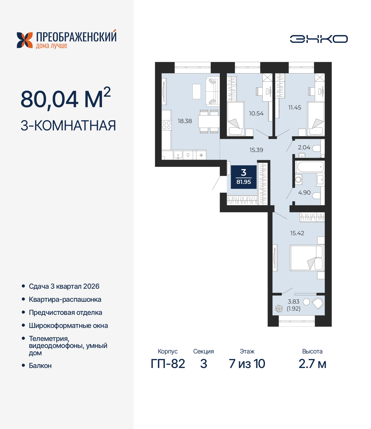 Трехкомнатная квартира от застройщика с предчистовой отделкой в ЖК "Преображенский" на 7 этаже. Общая площадь: 80.04 кв.м., жилая: 37.41 кв.м., площадь просторной кухни-столовой: 18.38 кв.м. Квартира - распашонка, без проходных комнат, окна выходят на paзные стороны дома. В квартире один балкон, один совмещенный и один раздельный санузел. Высота потолков 2.7 м. Дом монолитный, многоподъездный, переменной этажности, от 8 до 12 этажей. Квартира находится в 3-й секции высотой 10 этажей в корпусе ГП-82. На этаже 4 квартиры. В подъезде 1 пассажирский и 1 грузовой лифт. Окончание строительства - 3 квартал 2026 года. Оформление сделки по договору долевого участия. Квартал будет расположен в микрорайоне Славянский на пересечении улиц Мира и 70-летия Октября. Престижный район, собственный парк, вся необходимая для жизни, учёбы и работы инфраструктура — новая школа с бассейном и кванториумом, новый детский сад, поликлиника, спорткомплекс, магазины и др. Чтобы в квартирах было как можно больше свободного пространства, мы предусмотрели индивидуальные кладовые на цокольном этаже. Оставляйте коляски и сезонный спортинвентарь после прогулок здесь — удобно для вас и чисто для квартиры. В подземный паркинг можно спуститься на лифте прямо с квартирной площадки. (AQID02484112)