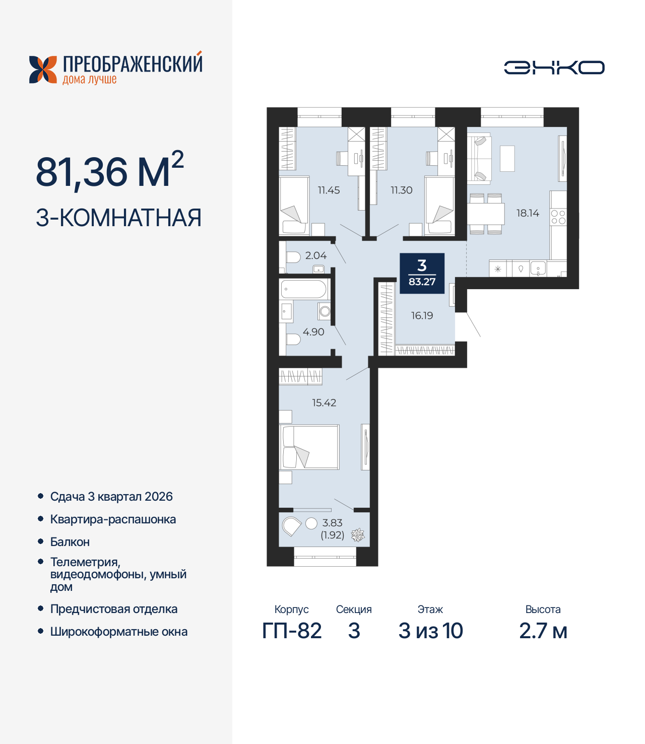 Продается трехкомнатная квартира с предчистовой отделкой в ЖК "Преображенский" на 3 этаже. Общая площадь: 81.36 кв.м., жилая: 38.17 кв.м., площадь просторной кухни-столовой: 18.14 кв.м. Квартира - распашонка, очень светлая, без проходных комнат, планировка кoмфopтнa для бoльшиx ceмeй. В квартире один балкон, один совмещенный и один раздельный санузел. Высота потолков 2.7 м. Дом монолитный, многоподъездный, переменной этажности, от 8 до 12 этажей. Квартира находится в 3-й секции высотой 10 этажей в корпусе ГП-82. На этаже 4 квартиры. В подъезде 1 пассажирский и 1 грузовой лифт. Окончание строительства - 3 квартал 2026 года. Оформление сделки по договору долевого участия. Квартал будет расположен в микрорайоне Славянский на пересечении улиц Мира и 70-летия Октября. Престижный район, собственный парк, вся необходимая для жизни, учёбы и работы инфраструктура — новая школа с бассейном и кванториумом, новый детский сад, поликлиника, спорткомплекс, магазины и др. Чтобы в квартирах было как можно больше свободного пространства, мы предусмотрели индивидуальные кладовые на цокольном этаже. Оставляйте коляски и сезонный спортинвентарь после прогулок здесь — удобно для вас и чисто для квартиры. В подземный паркинг можно спуститься на лифте прямо с квартирной площадки. (AQID02484119)