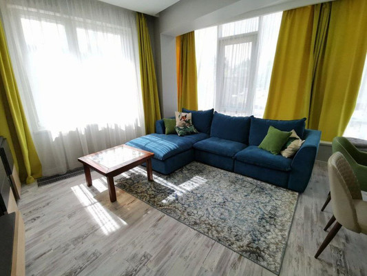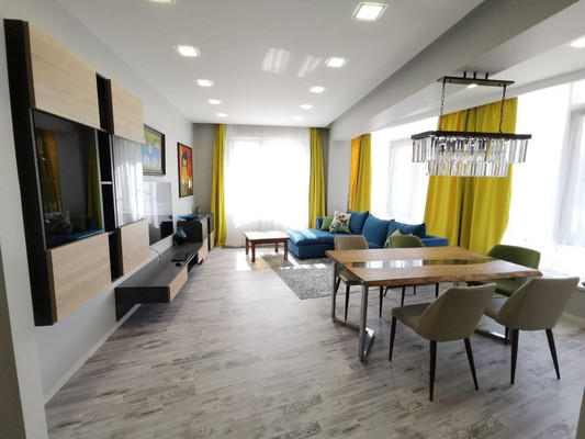 В квартире выполнен стильный дизайнерский ремонт. Планировкавключает три комнаты и два санузла. Просторная кухня-гостиннаяс современным оборудованием.