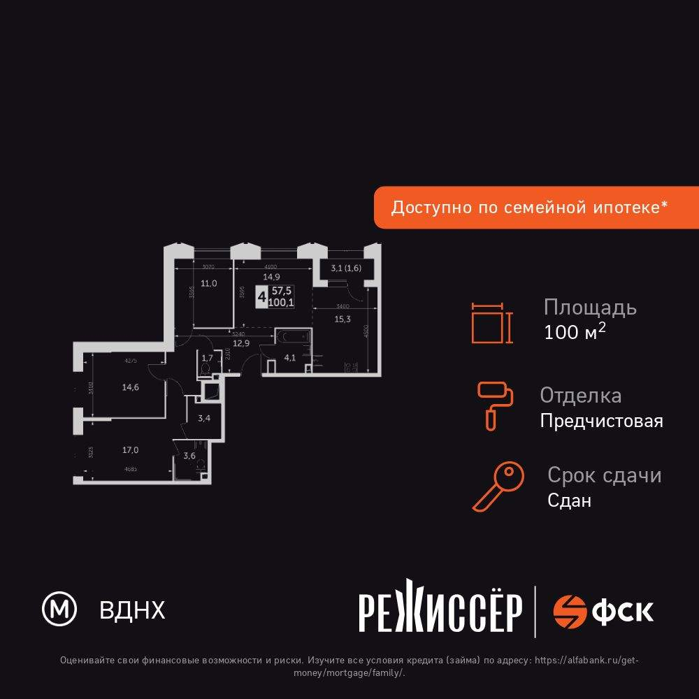- Жилая площадь 57.5 м²