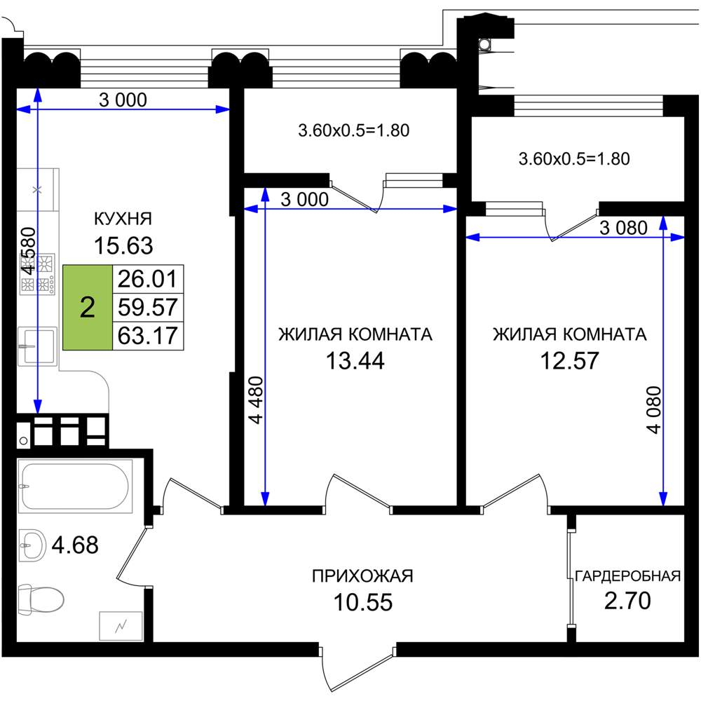 - Общая площадь 63.17 м²