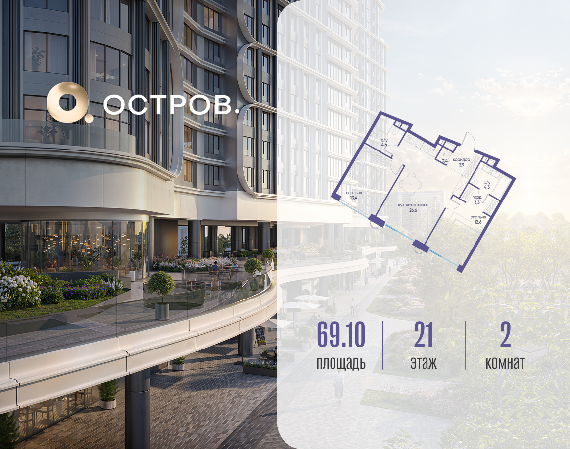 Продаётся двухкомнатная квартира от застройщика: общая площадь 69.12 м², жилая 26.00 м², кухня 26.60 м², 21, жилой квартал «Остров 7», корпус 7 (7 квартал) (секция 2). срок сдачи: 4-кв. 2025. , 2 санузла: 2 совмещенных. В жилой зоне 2 больших окна на одну сторону, хорошая инсоляция. Позвоните сейчас и забронируйте квартиру! Купите квартиру в доме у прибрежного парка, в квартале ОСТРОВ.7. Это семь корпусов премиум- и бизнес-класса в одном из лучших мест ОСТРОВА - между бульваром и парком, поблизости от реки. Стильные корпуса имеют узнаваемый вид благодаря бионической пластике фасадов, приподнятых над землей. Для жителей предусмотрены детский клуб, фитнес-рум, коворкинг, переговорные, лаунжи. На крышах устроены видовые общественные пространства с зонами для отдыха и спорта. Двор расположен на двух уровнях: нижний ландшафтный парк и верхняя городская терраса. ОСТРОВ.7 - часть жилого комплекса на западе Москвы, в 15 минутах езды от центра. Это настоящий заповедник посреди большого города, в окружении реки и 650 га заповедников. Здесь все необходимое находится по соседству: от детского сада до супермаркета, от фитнес-зала до серфинг-центра. На территории созданы все условия для отдыха и общения: клубная инфраструктура в домах и дворы-парки, набережные и променады, маршруты для спортсменов, детей и возрастных жителей. В нескольких минутах ходьбы расположена станция метро "Терехово" БКЛ. На автомобиле - 10 минут до Москва-Сити и 15 минут до Садового кольца.