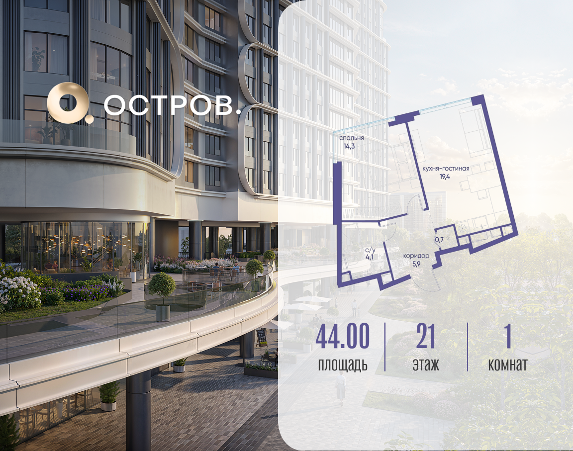 Продаётся однокомнатная квартира от застройщика: общая площадь 44.02 м², жилая 14.30 м², кухня 19.40 м², 21, жилой квартал «Остров 7», корпус 7 (7 квартал) (секция 1). срок сдачи: 4-кв. 2025. , 1 совмещенный санузел. В жилой зоне 2 больших окна на одну сторону, хорошая инсоляция. Позвоните сейчас и забронируйте квартиру! Купите квартиру в доме у прибрежного парка, в квартале ОСТРОВ.7. Это семь корпусов премиум- и бизнес-класса в одном из лучших мест ОСТРОВА - между бульваром и парком, поблизости от реки. Стильные корпуса имеют узнаваемый вид благодаря бионической пластике фасадов, приподнятых над землей. Для жителей предусмотрены детский клуб, фитнес-рум, коворкинг, переговорные, лаунжи. На крышах устроены видовые общественные пространства с зонами для отдыха и спорта. Двор расположен на двух уровнях: нижний ландшафтный парк и верхняя городская терраса. ОСТРОВ.7 - часть жилого комплекса на западе Москвы, в 15 минутах езды от центра. Это настоящий заповедник посреди большого города, в окружении реки и 650 га заповедников. Здесь все необходимое находится по соседству: от детского сада до супермаркета, от фитнес-зала до серфинг-центра. На территории созданы все условия для отдыха и общения: клубная инфраструктура в домах и дворы-парки, набережные и променады, маршруты для спортсменов, детей и возрастных жителей. В нескольких минутах ходьбы расположена станция метро "Терехово" БКЛ. На автомобиле - 10 минут до Москва-Сити и 15 минут до Садового кольца.