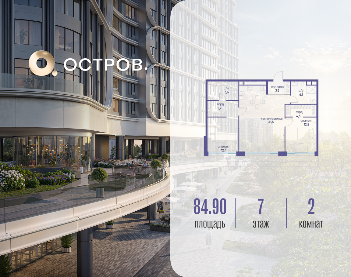 Продаётся двухкомнатная квартира от застройщика: общая площадь 84.92 м², жилая 24.90 м², кухня 33.50 м², 7, жилой квартал «Остров 7», корпус 6 (7 квартал) (секция 1). срок сдачи: 4-кв. 2025. , 2 санузла: 2 совмещенных. В жилой зоне 2 больших окна на одну сторону, хорошая инсоляция. Позвоните сейчас и забронируйте квартиру! Купите квартиру в доме у прибрежного парка, в квартале ОСТРОВ.7. Это семь корпусов премиум- и бизнес-класса в одном из лучших мест ОСТРОВА - между бульваром и парком, поблизости от реки. Стильные корпуса имеют узнаваемый вид благодаря бионической пластике фасадов, приподнятых над землей. Для жителей предусмотрены детский клуб, фитнес-рум, коворкинг, переговорные, лаунжи. На крышах устроены видовые общественные пространства с зонами для отдыха и спорта. Двор расположен на двух уровнях: нижний ландшафтный парк и верхняя городская терраса. ОСТРОВ.7 - часть жилого комплекса на западе Москвы, в 15 минутах езды от центра. Это настоящий заповедник посреди большого города, в окружении реки и 650 га заповедников. Здесь все необходимое находится по соседству: от детского сада до супермаркета, от фитнес-зала до серфинг-центра. На территории созданы все условия для отдыха и общения: клубная инфраструктура в домах и дворы-парки, набережные и променады, маршруты для спортсменов, детей и возрастных жителей. В нескольких минутах ходьбы расположена станция метро "Терехово" БКЛ. На автомобиле - 10 минут до Москва-Сити и 15 минут до Садового кольца.
