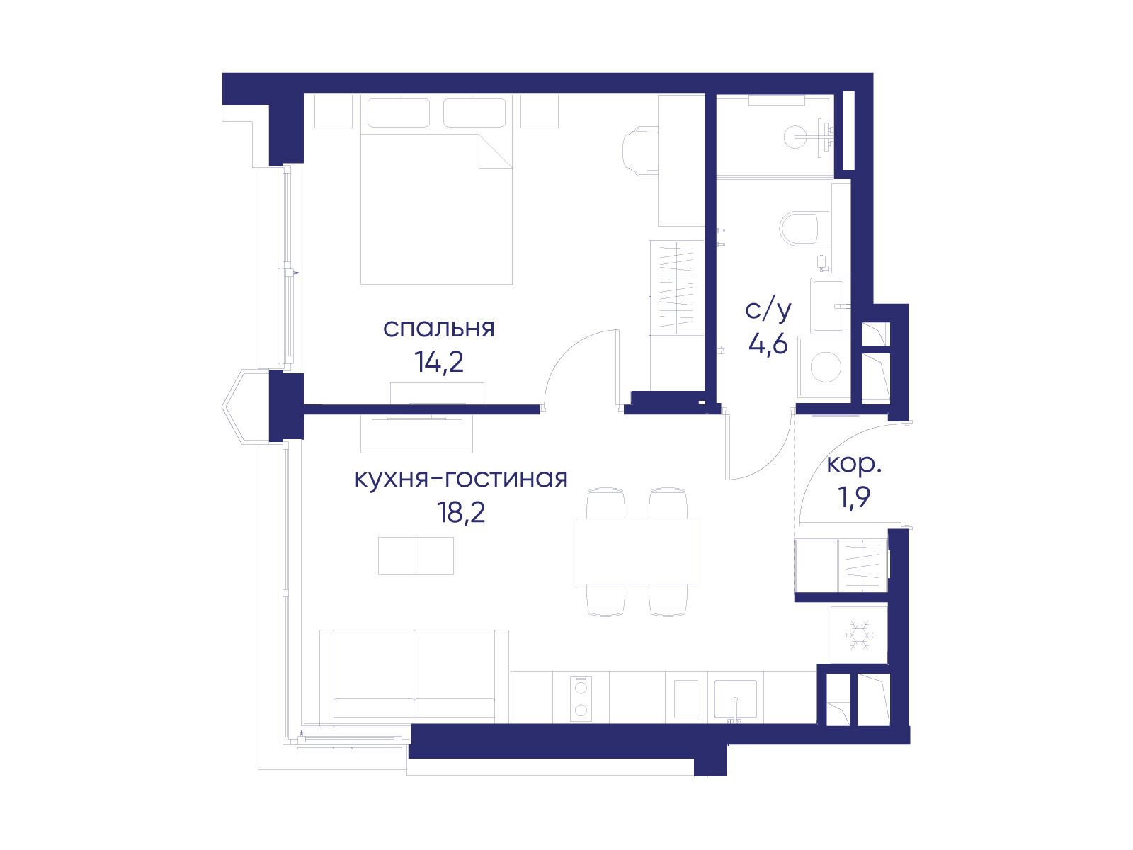 - Жилая площадь 14.2 м²