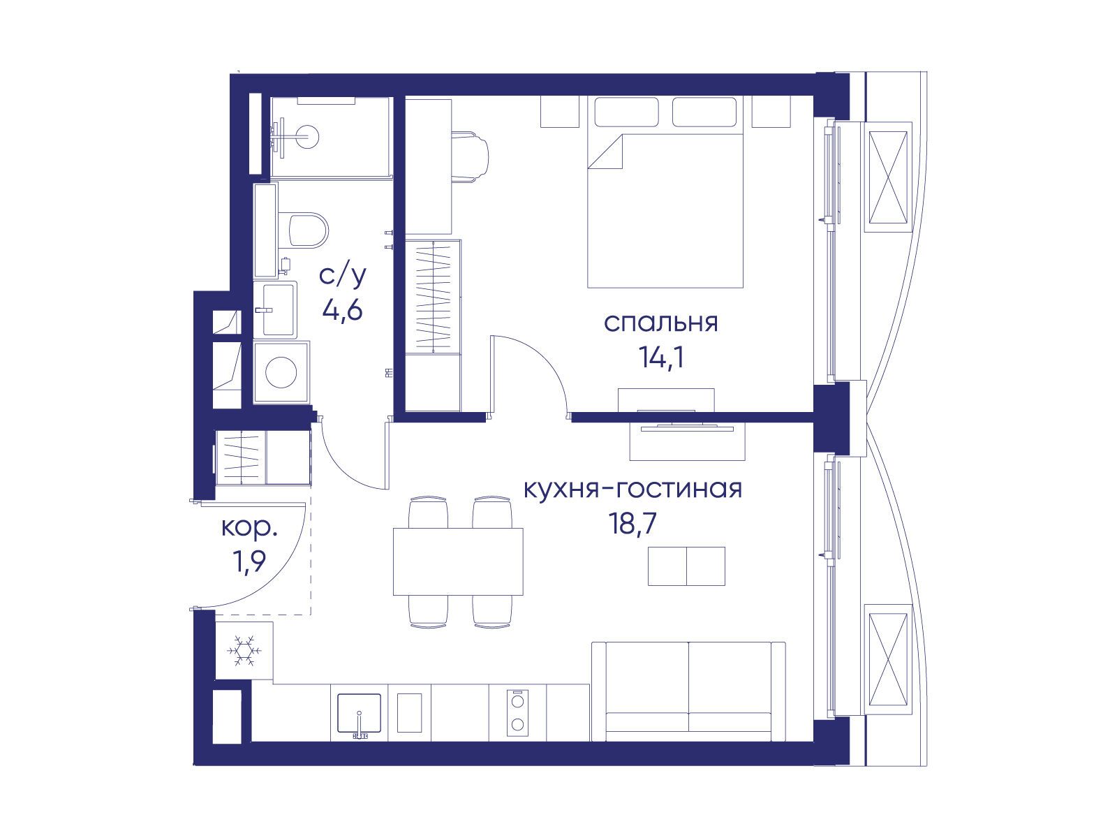 - Жилая площадь 14.1 м²