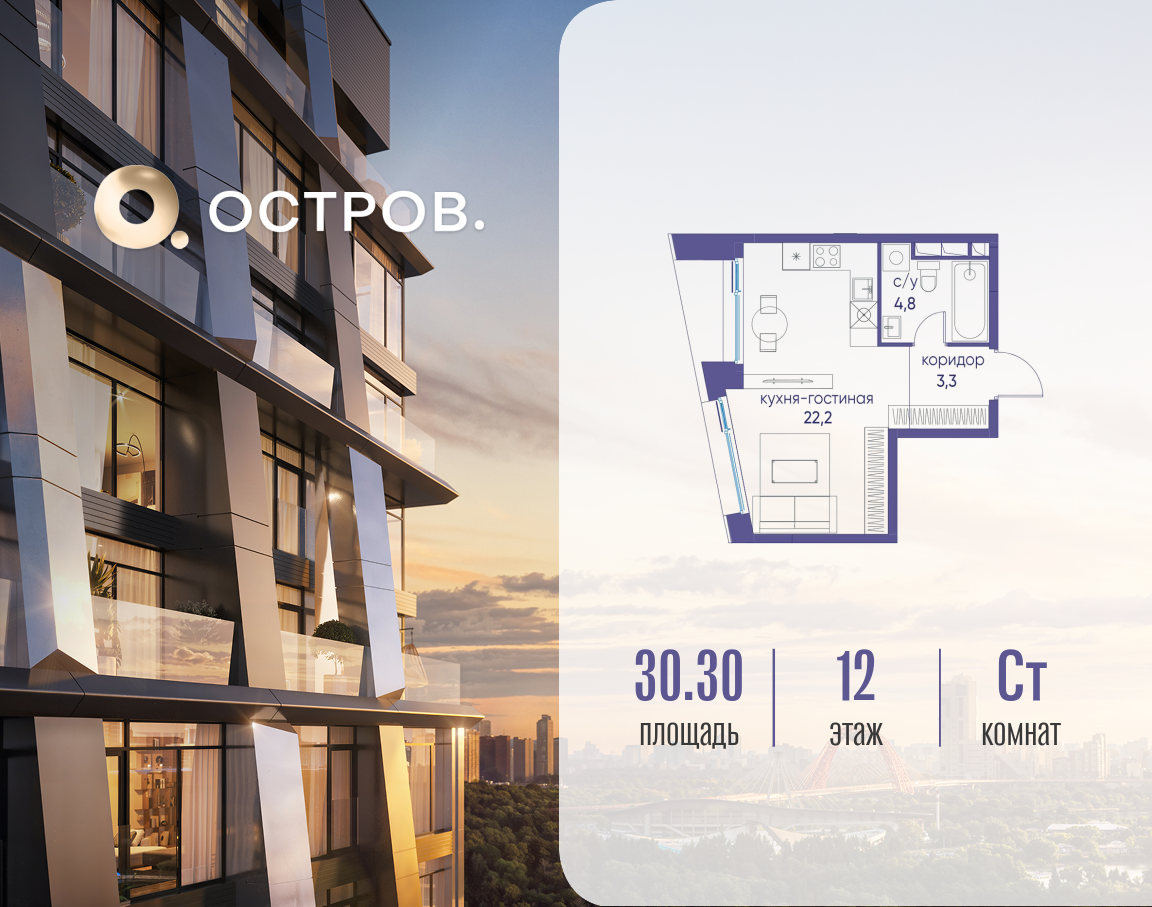 Скидка до 8% действует до 31.03.2026 г. при 100% оплате и не субсидированной ипотеке. Продаётся студия от застройщика: общая площадь 30.32 м², жилая 17.20 м², кухня 5.00 м², 12, жилой квартал «Остров 12», корпус 1 (12.1 квартал) (секция 2). срок сдачи: 4-кв. 2025. , 1 совмещенный санузел. В жилой зоне 2 больших окна на одну сторону, хорошая инсоляция. Позвоните сейчас и забронируйте квартиру! Купите квартиру для курортной жизни в Москве в квартале ОСТРОВ.12.1. Это единственный на ОСТРОВЕ квартал бизнес-класса, расположенный на первой линии у реки - здесь царит атмосфера ежедневного отпуска. Дома созданы в узнаваемом футуристичном стиле и выглядят как произведения современного искусства. Для жителей предусмотрены фитнес-рум и детский клуб, гостиная и кинотеатр, переговорные и репетиторские комнаты. На крышах устроены видовые общественные пространства с зонами для йоги, коворкингами, лаунжами. Двор-парк располагает всем необходимым для отдыха и общения всех возрастов. ОСТРОВ.12.1 - часть жилого комплекса на западе Москвы, в 15 минутах езды от центра. Это настоящий заповедник посреди большого города, в окружении реки и 650 га заповедников. Здесь все необходимое находится по соседству: от детского сада до супермаркета, от фитнес-зала до серфинг-центра. На территории созданы все условия для отдыха и общения: клубная инфраструктура в домах и дворы-парки, набережные и променады, маршруты для спортсменов, детей и возрастных жителей. В нескольких минутах ходьбы расположена станция метро "Мнёвники" БКЛ. На автомобиле - 10 минут до Москва-Сити и 15 минут до Садового кольца.