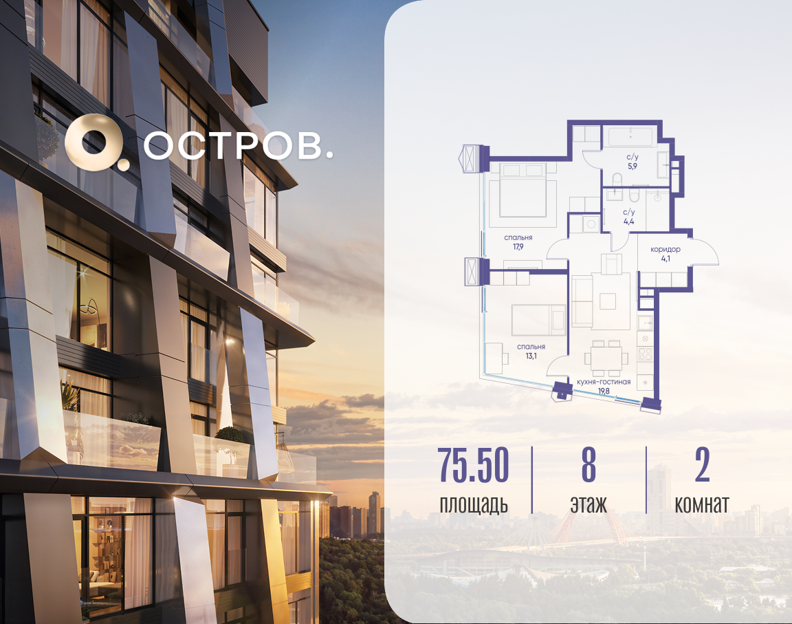 Скидка до 8% действует до 15.04.2026 г. при 100% оплате и не субсидированной ипотеке. Продаётся 2-комн. квартира от застройщика: общая площадь 75.52 м², жилая 34.60 м², кухня 23.30 м², 8-й этаж, жилой квартал «Остров 12», корпус 2 (секция 1). Срок сдачи: 1 квартал 2029 года. 2 совмещенных санузла. В жилой зоне 2 больших окна на одну сторону, хорошая инсоляция. Позвоните сейчас и забронируйте квартиру! ОСТРОВ от Донстрой — жилой комплекс на западе Москвы, в Мневниковской пойме. Уникальное преимущество комплекса — в том, что он обособлен от города рекой и природным парком (650 га). Благодаря природному окружению эта территория имеет лучший экологический рейтинг в столице. Кварталы ОСТРОВА объединены ландшафтным дизайном в единое пространство — с набережными и Центральным бульваром. На ОСТРОВЕ любые объекты, необходимые для полноценной жизни и отдыха, находятся на расстоянии 15-минутной прогулки. Торговый центр и супермаркеты, кафе и рестораны, фитнес, салоны красоты, школы и детские сады. А также крупнейший в Москве спортивный кластер.