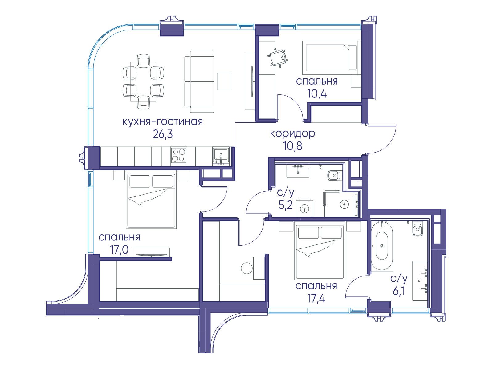 - Площадь кухни 26.3 м²