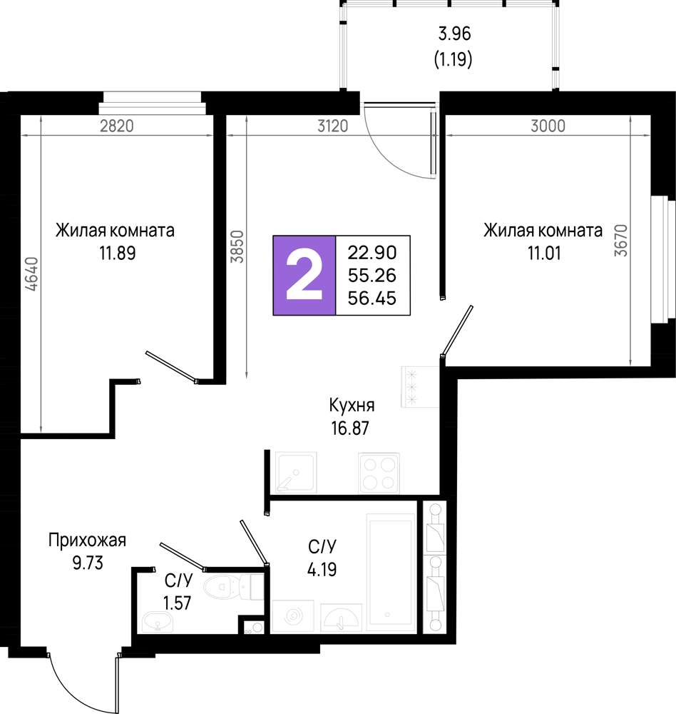 - Общая площадь 56.45 м²