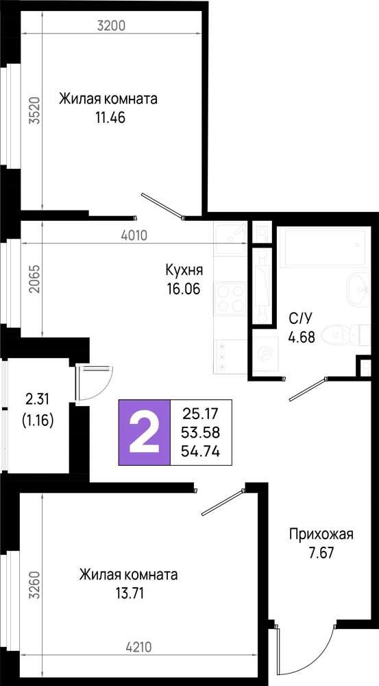 - Общая площадь 54.74 м²