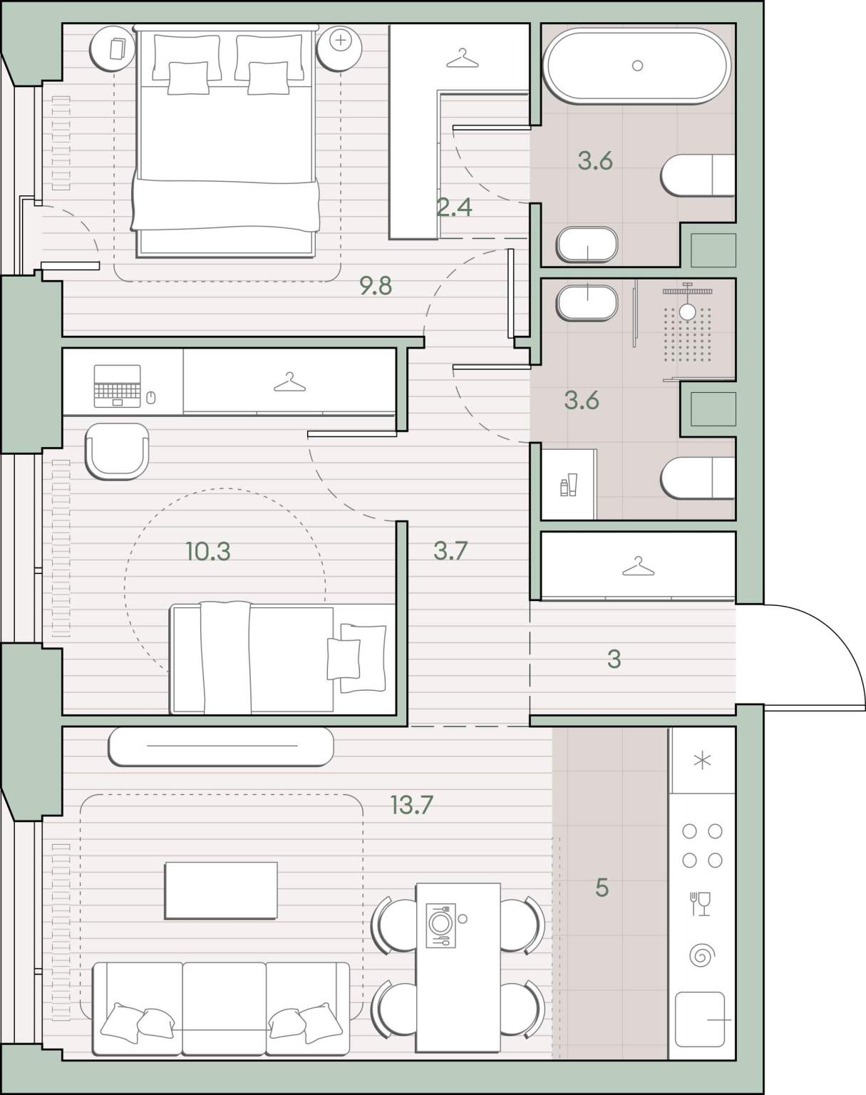 - Жилая площадь 33.8 м²