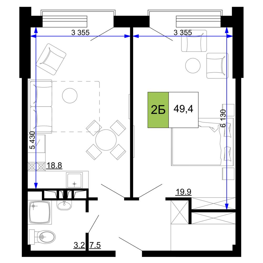 - Общая площадь 49.4 м²