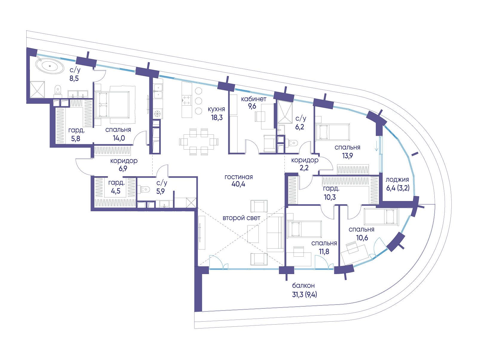 - Площадь кухни 58.7 м²