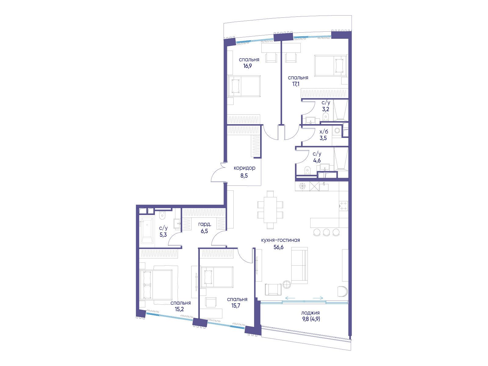 - Площадь кухни 56.6 м²