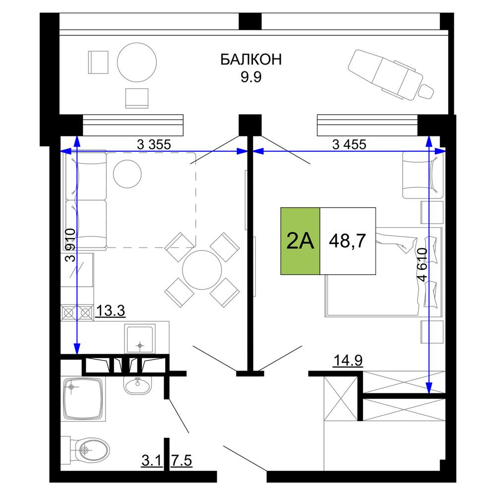 - Общая площадь 48.7 м²