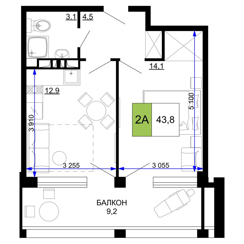 - Общая площадь 43.8 м²