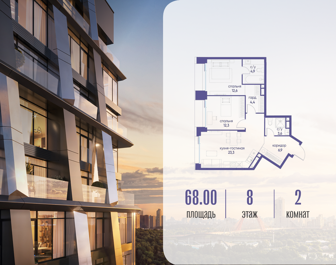 Продаётся двухкомнатная квартира от застройщика: общая площадь 68.02 м², жилая 24.90 м², кухня 23.30 м², 8, жилой квартал «Остров 12», корпус 1 (12.1 квартал) (секция 1). срок сдачи: 4-кв. 2025. , 2 санузла: 2 совмещенных. В жилой зоне 2 больших окна на одну сторону, хорошая инсоляция. Позвоните сейчас и забронируйте квартиру! Купите квартиру для курортной жизни в Москве в квартале ОСТРОВ.12.1. Это единственный на ОСТРОВЕ квартал бизнес-класса, расположенный на первой линии у реки - здесь царит атмосфера ежедневного отпуска. Дома созданы в узнаваемом футуристичном стиле и выглядят как произведения современного искусства. Для жителей предусмотрены фитнес-рум и детский клуб, гостиная и кинотеатр, переговорные и репетиторские комнаты. На крышах устроены видовые общественные пространства с зонами для йоги, коворкингами, лаунжами. Двор-парк располагает всем необходимым для отдыха и общения всех возрастов. ОСТРОВ.12.1 - часть жилого комплекса на западе Москвы, в 15 минутах езды от центра. Это настоящий заповедник посреди большого города, в окружении реки и 650 га заповедников. Здесь все необходимое находится по соседству: от детского сада до супермаркета, от фитнес-зала до серфинг-центра. На территории созданы все условия для отдыха и общения: клубная инфраструктура в домах и дворы-парки, набережные и променады, маршруты для спортсменов, детей и возрастных жителей. В нескольких минутах ходьбы расположена станция метро "Мнёвники" БКЛ. На автомобиле - 10 минут до Москва-Сити и 15 минут до Садового кольца.