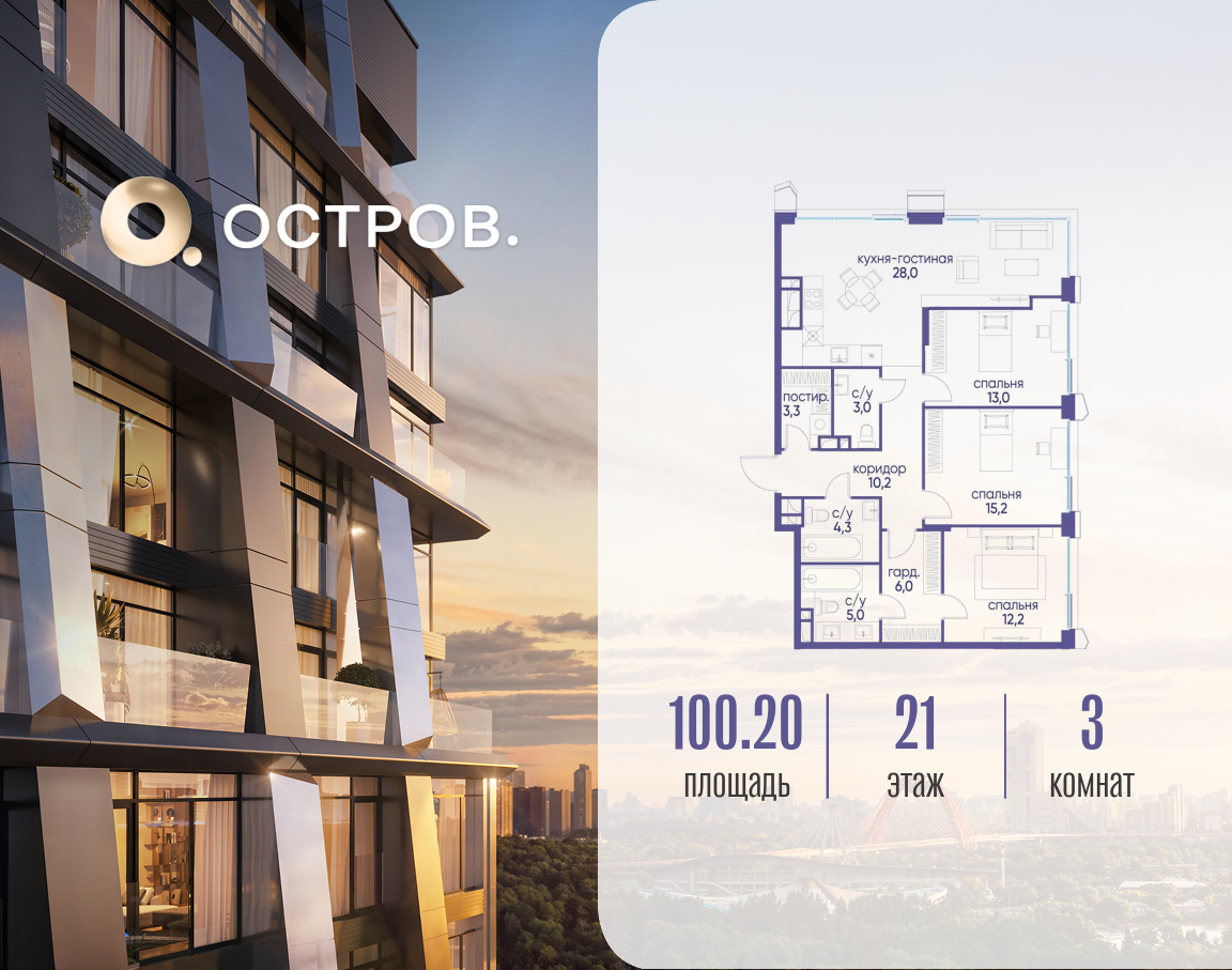 Продаётся трехкомнатная квартира от застройщика: общая площадь 100.22 м², жилая 40.40 м², кухня 28.00 м², 21, жилой квартал «Остров 12», корпус 3 (12.1 квартал) (секция 1). срок сдачи: 4-кв. 2025. , 3 санузла: 1 раздельный и 2 совмещенных. В жилой зоне 2 больших окна на одну сторону, хорошая инсоляция. Позвоните сейчас и забронируйте квартиру! Купите квартиру для курортной жизни в Москве в квартале ОСТРОВ.12.1. Это единственный на ОСТРОВЕ квартал бизнес-класса, расположенный на первой линии у реки - здесь царит атмосфера ежедневного отпуска. Дома созданы в узнаваемом футуристичном стиле и выглядят как произведения современного искусства. Для жителей предусмотрены фитнес-рум и детский клуб, гостиная и кинотеатр, переговорные и репетиторские комнаты. На крышах устроены видовые общественные пространства с зонами для йоги, коворкингами, лаунжами. Двор-парк располагает всем необходимым для отдыха и общения всех возрастов. ОСТРОВ.12.1 - часть жилого комплекса на западе Москвы, в 15 минутах езды от центра. Это настоящий заповедник посреди большого города, в окружении реки и 650 га заповедников. Здесь все необходимое находится по соседству: от детского сада до супермаркета, от фитнес-зала до серфинг-центра. На территории созданы все условия для отдыха и общения: клубная инфраструктура в домах и дворы-парки, набережные и променады, маршруты для спортсменов, детей и возрастных жителей. В нескольких минутах ходьбы расположена станция метро "Мнёвники" БКЛ. На автомобиле - 10 минут до Москва-Сити и 15 минут до Садового кольца.