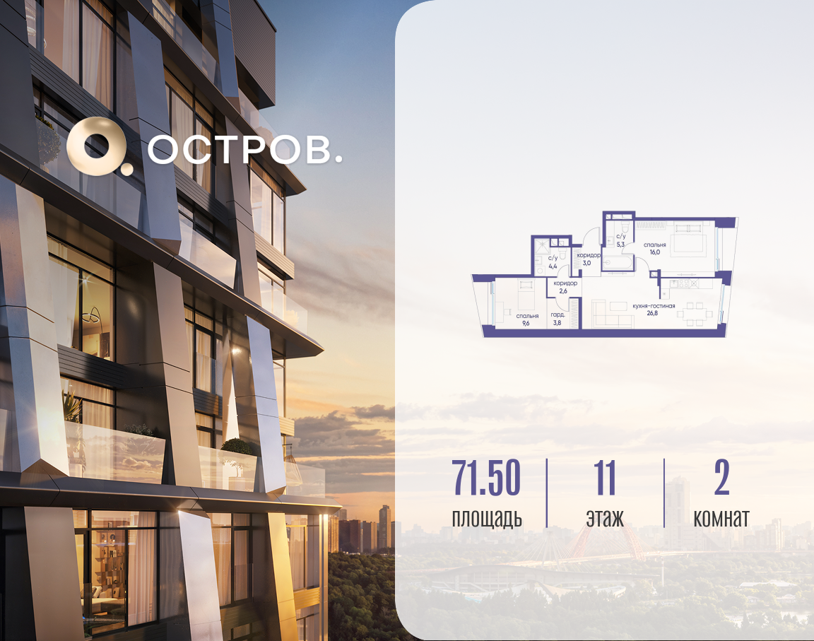 Продаётся двухкомнатная квартира от застройщика: общая площадь 71.52 м², жилая 29.40 м², кухня 26.80 м², 11, жилой квартал «Остров 12», корпус 1 (12.1 квартал) (секция 2). срок сдачи: 4-кв. 2025. , 2 санузла: 2 совмещенных. В жилой зоне 2 больших окна на одну сторону, хорошая инсоляция. Позвоните сейчас и забронируйте квартиру! Купите квартиру для курортной жизни в Москве в квартале ОСТРОВ.12.1. Это единственный на ОСТРОВЕ квартал бизнес-класса, расположенный на первой линии у реки - здесь царит атмосфера ежедневного отпуска. Дома созданы в узнаваемом футуристичном стиле и выглядят как произведения современного искусства. Для жителей предусмотрены фитнес-рум и детский клуб, гостиная и кинотеатр, переговорные и репетиторские комнаты. На крышах устроены видовые общественные пространства с зонами для йоги, коворкингами, лаунжами. Двор-парк располагает всем необходимым для отдыха и общения всех возрастов. ОСТРОВ.12.1 - часть жилого комплекса на западе Москвы, в 15 минутах езды от центра. Это настоящий заповедник посреди большого города, в окружении реки и 650 га заповедников. Здесь все необходимое находится по соседству: от детского сада до супермаркета, от фитнес-зала до серфинг-центра. На территории созданы все условия для отдыха и общения: клубная инфраструктура в домах и дворы-парки, набережные и променады, маршруты для спортсменов, детей и возрастных жителей. В нескольких минутах ходьбы расположена станция метро "Мнёвники" БКЛ. На автомобиле - 10 минут до Москва-Сити и 15 минут до Садового кольца.