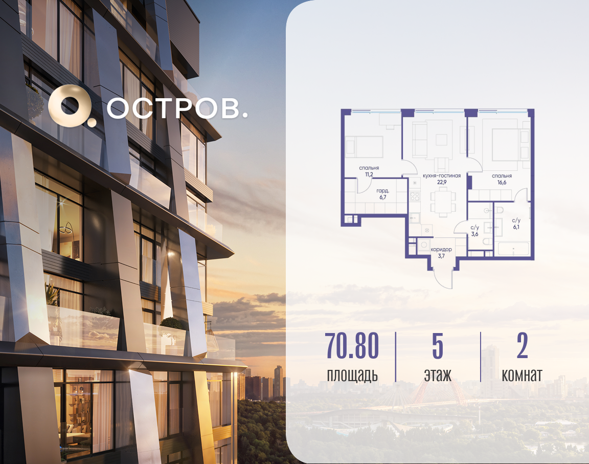 Продаётся 2-комн. квартира от застройщика: общая площадь 70.82 м², жилая 27.80 м², кухня 22.90 м², 5-й этаж, жилой квартал «Остров 12», корпус 2 (секция 1). Срок сдачи: 1 квартал 2029 года. 2 совмещенных санузла. В жилой зоне 2 больших окна на одну сторону, хорошая инсоляция. Позвоните сейчас и забронируйте квартиру! ОСТРОВ от Донстрой — жилой комплекс на западе Москвы, в Мневниковской пойме. Уникальное преимущество комплекса — в том, что он обособлен от города рекой и природным парком (650 га). Благодаря природному окружению эта территория имеет лучший экологический рейтинг в столице. Кварталы ОСТРОВА объединены ландшафтным дизайном в единое пространство — с набережными и Центральным бульваром. На ОСТРОВЕ любые объекты, необходимые для полноценной жизни и отдыха, находятся на расстоянии 15-минутной прогулки. Торговый центр и супермаркеты, кафе и рестораны, фитнес, салоны красоты, школы и детские сады. А также крупнейший в Москве спортивный кластер.