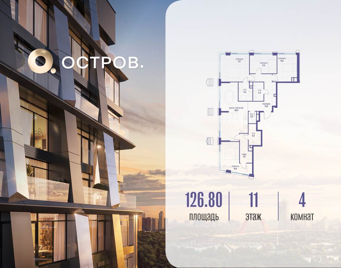 Продаётся 4-комн. квартира от застройщика: общая площадь 126.82 м², жилая 57.80 м², кухня 30.00 м², 11-й этаж, жилой квартал «Остров 12», корпус 2 (секция 1). Срок сдачи: 1 квартал 2029 года. 3 совмещенных санузла. В жилой зоне 2 больших окна на одну сторону, хорошая инсоляция. Позвоните сейчас и забронируйте квартиру! ОСТРОВ от Донстрой — жилой комплекс на западе Москвы, в Мневниковской пойме. Уникальное преимущество комплекса — в том, что он обособлен от города рекой и природным парком (650 га). Благодаря природному окружению эта территория имеет лучший экологический рейтинг в столице. Кварталы ОСТРОВА объединены ландшафтным дизайном в единое пространство — с набережными и Центральным бульваром. На ОСТРОВЕ любые объекты, необходимые для полноценной жизни и отдыха, находятся на расстоянии 15-минутной прогулки. Торговый центр и супермаркеты, кафе и рестораны, фитнес, салоны красоты, школы и детские сады. А также крупнейший в Москве спортивный кластер.