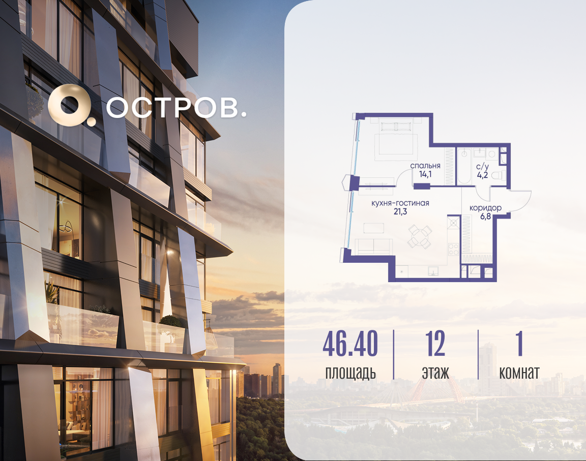Продаётся однокомнатная квартира от застройщика: общая площадь 46.42 м², жилая 14.10 м², кухня 21.30 м², 12, жилой квартал «Остров 12», корпус 3 (12.1 квартал) (секция 1). срок сдачи: 4-кв. 2025. , 1 совмещенный санузел. В жилой зоне 2 больших окна на одну сторону, хорошая инсоляция. Позвоните сейчас и забронируйте квартиру! Купите квартиру для курортной жизни в Москве в квартале ОСТРОВ.12.1. Это единственный на ОСТРОВЕ квартал бизнес-класса, расположенный на первой линии у реки - здесь царит атмосфера ежедневного отпуска. Дома созданы в узнаваемом футуристичном стиле и выглядят как произведения современного искусства. Для жителей предусмотрены фитнес-рум и детский клуб, гостиная и кинотеатр, переговорные и репетиторские комнаты. На крышах устроены видовые общественные пространства с зонами для йоги, коворкингами, лаунжами. Двор-парк располагает всем необходимым для отдыха и общения всех возрастов. ОСТРОВ.12.1 - часть жилого комплекса на западе Москвы, в 15 минутах езды от центра. Это настоящий заповедник посреди большого города, в окружении реки и 650 га заповедников. Здесь все необходимое находится по соседству: от детского сада до супермаркета, от фитнес-зала до серфинг-центра. На территории созданы все условия для отдыха и общения: клубная инфраструктура в домах и дворы-парки, набережные и променады, маршруты для спортсменов, детей и возрастных жителей. В нескольких минутах ходьбы расположена станция метро "Мнёвники" БКЛ. На автомобиле - 10 минут до Москва-Сити и 15 минут до Садового кольца.