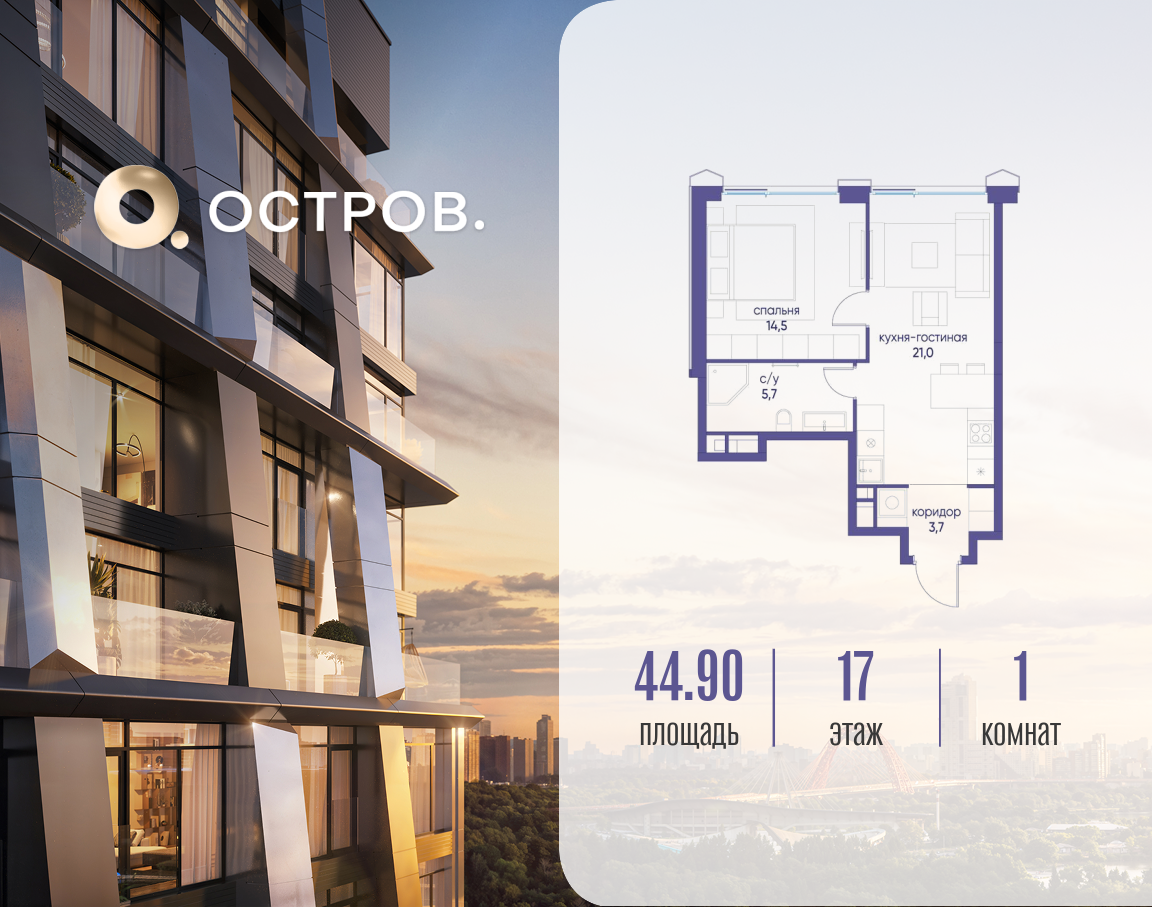 Продаётся 1-комн. квартира от застройщика: общая площадь 44.92 м², жилая 14.50 м², кухня 21.00 м², 17-й этаж, жилой квартал «Остров 12», корпус 2 (секция 1). Срок сдачи: 1 квартал 2029 года. 1 совмещенный санузел. В жилой зоне 2 больших окна на одну сторону, хорошая инсоляция. Позвоните сейчас и забронируйте квартиру! ОСТРОВ от Донстрой — жилой комплекс на западе Москвы, в Мневниковской пойме. Уникальное преимущество комплекса — в том, что он обособлен от города рекой и природным парком (650 га). Благодаря природному окружению эта территория имеет лучший экологический рейтинг в столице. Кварталы ОСТРОВА объединены ландшафтным дизайном в единое пространство — с набережными и Центральным бульваром. На ОСТРОВЕ любые объекты, необходимые для полноценной жизни и отдыха, находятся на расстоянии 15-минутной прогулки. Торговый центр и супермаркеты, кафе и рестораны, фитнес, салоны красоты, школы и детские сады. А также крупнейший в Москве спортивный кластер.